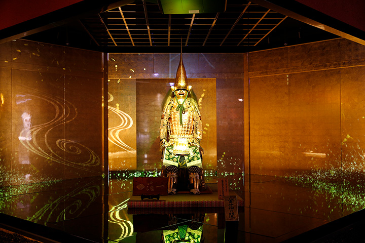 金澤生產了日本大部分的金箔。 「博市」的金箔博物館以親手操作為主,專注於金箔工藝,是個能近距離觀察、觸摸並品嚐金箔的珍貴場所。 首先,我們參觀了地下畫廊,可以透過影片和示範學習如何製作金箔。 在覆蓋著一萬張金箔的「金箔室」裡,供奉著前田俊家盔甲的金色複製品,閃爍的投影映射也令人興奮。 在虛擬體驗中,戴著金色盔甲頭盔的臉龐會投影在螢幕上,家長和孩子也能一起拍照。