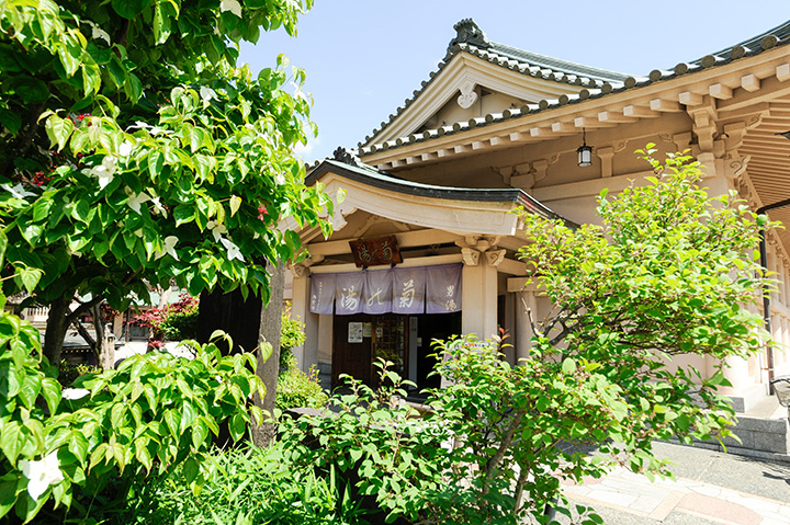 中央建築是女浴場「菊之湯」,右邊是舉辦山中傳統表演藝術的「山中劇場」。