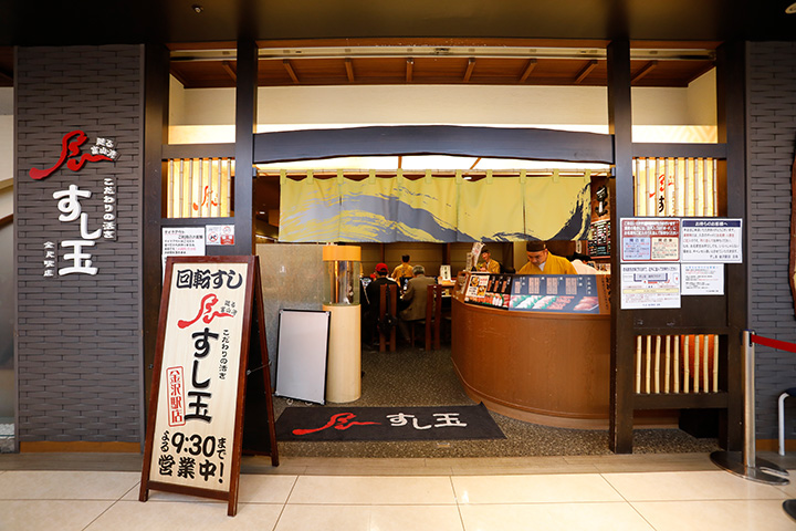 大約30年前,它最初是一家食堂,1999年變成了一家迴轉壽司店。 這家店位於金澤中央市場的正前方,其信條是從金澤港開始,從全國各地購買新鮮的魚,並以低廉的價格提供。 平日擠滿了當地的上班族,晚上則擠滿了家庭,大部分人都點了套餐。 午餐套餐有7種,「A套餐」10貫握壽司864日圓,「飽腹午餐」12貫999日圓。 單點價格也很合理,每道菜108~648日圓。