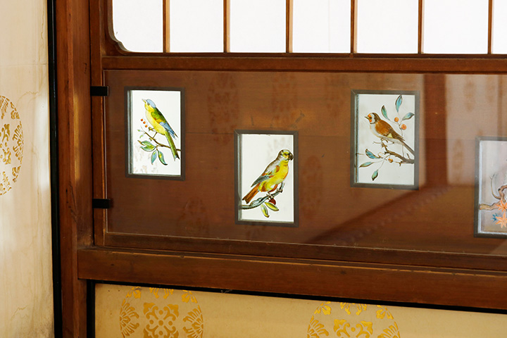 與樓下享有盛譽的樓下相比,上層由七個房間組成,採用白色木製數寄屋風格書院。 每個房間都有不同的設計,特別引人注目,其中「群青室」和「群青閱覽室」特別引人注目。 折疊的天花板接縫處裝飾著群青藍(群青藍),令人驚訝的是,這種鮮豔的顏色是在江戶時代使用的。 壁龕和牆壁的顏色也很華麗。 障子屏風中央鑲嵌著來自荷蘭的齒輪工,無需打開障子即可看到外面。