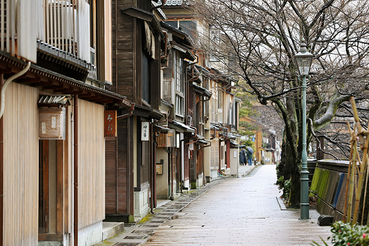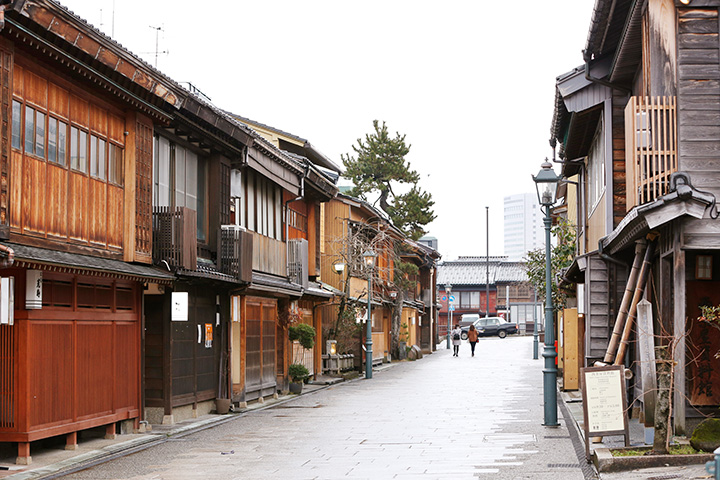 在金澤市的三個茶館區中,淺野川東側展開的「東茶屋街」是1820年(文世3年)左右建造的茶館區之一,東西兩側各有一座。 由於躲過了第二次世界大戰的破壞,整齊的紅殼格子建築保留了當時的樣子。 主要的鵝卵石街道上點綴著茶館建築,人們在榻榻米房間裡玩耍。 旁邊的小巷裡有藝伎經常光顧的紮髮店、舞蹈和三味線練習館,可以一邊悠閒地散步,一邊欣賞充滿日本風情的城市景觀。