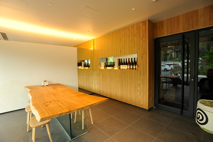 現代入口的盡頭是銷售空間(僅接受信用卡)。 為了體現野口先生「盡可能在手能觸摸的地方融入木材」的願望,客桌由大單板製成,牆壁採用木材裝飾。 這是一個可以一邊看著牆上排列的產品一邊平靜地選擇自己喜歡的空間。