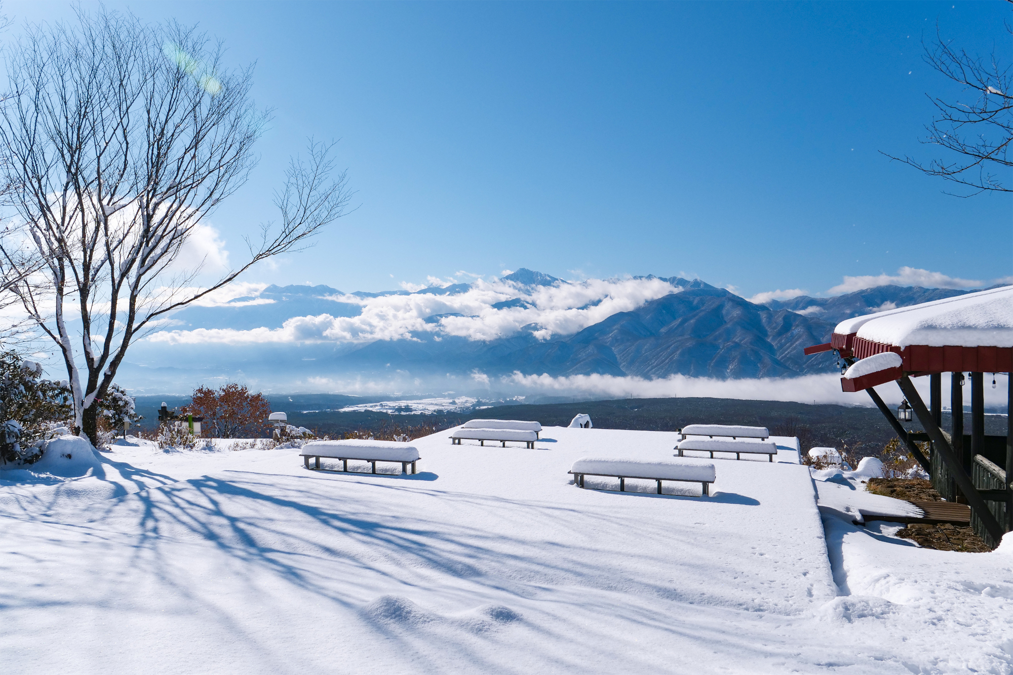 天氣好時,可以搭乘單人纜車,穿著靴子和滑雪靴前往「Nobogo Hill Observatory」,那裡有「雲層上的木製甲板」。 你可以欣賞日本三大山峰的壯闊全景:富士山、北山和奧穗高山。