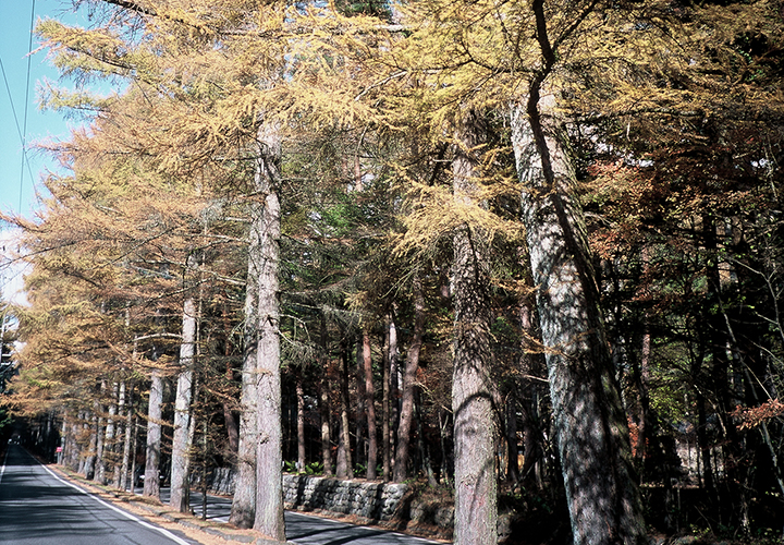 從十月中旬到十一月初,路中央排列的高大落葉松會同時變成黃色,讓輕井澤的城市景觀更加鮮明。 這裡是著名的觀光景點,被選為「新日本街樹百景」之一。 也建議租借自行車。
