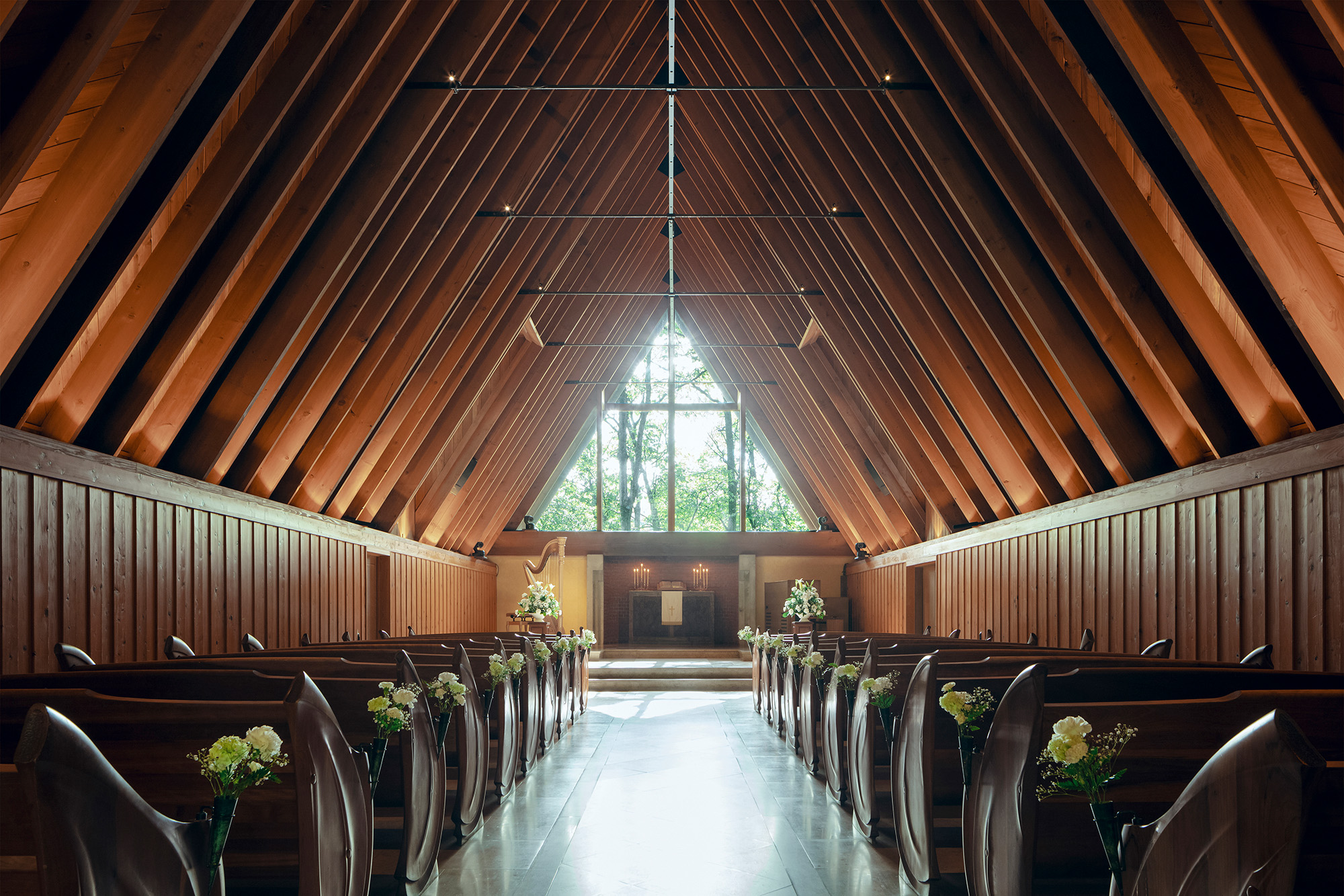 輕輕井澤星野度假區的茂密森林中,輕井澤甲源教堂展現出四季樹木的美麗景致。 教堂前的樹蔭小徑兩旁種滿桂樹,心形葉子變黃,散發出甜美的香氣。 森林中的楓樹也有美麗的秋葉,紅色和黃色重疊的顏色在秋天的藍天下顯得格外悅目。
