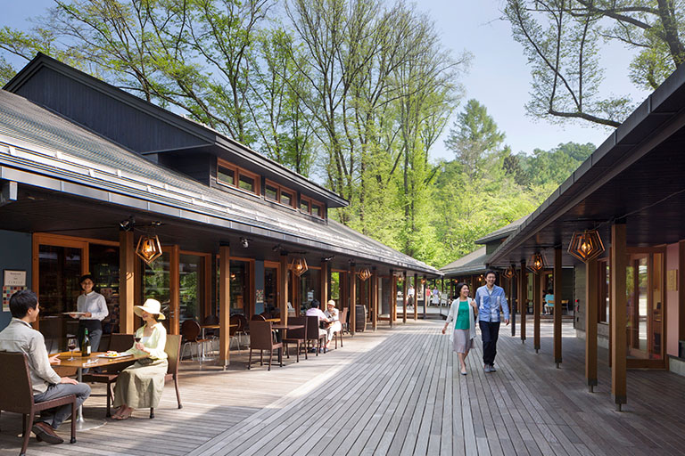 「榆樹街小鎮」是一個擁有16家商店和餐廳的小鎮,靈感來自輕井澤別墅町的生活理念。 榆樹伸展著枝條,露台像是繞著大樹般展開。 這裡設有午睡甲板和河畔長椅,讓你感受到輕井澤獨特的風貌,非常適合購物或散步後的休息。