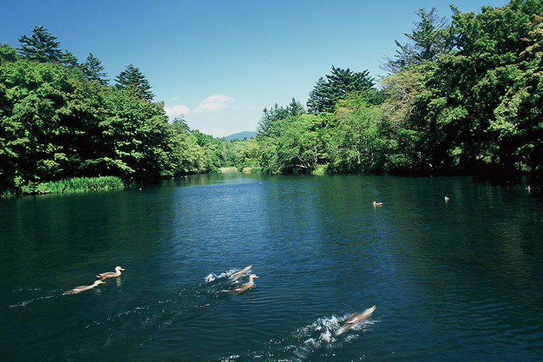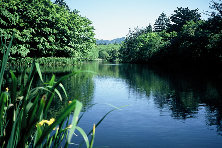 從視野良好的池塘南入口附近看去,清澈的水面倒映著樹木,藍天也倒映著,景色非常壯觀。 這裡也是一個受歡迎的拍照地點,因為它可以欣賞到新綠、深綠色、紅葉和捕捉季節的雪景。