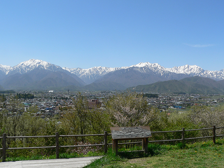 從海拔約770公尺的御町公園,可以看到櫻花、阿爾卑斯山和城市