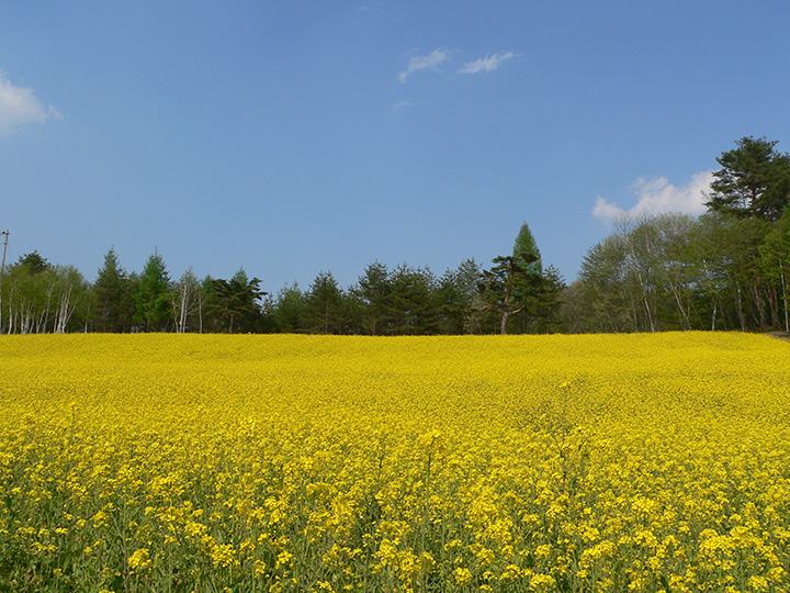 黃色的地毯很生動。 從這片田裡的油菜籽中收穫的“菜花油”是大町的特產