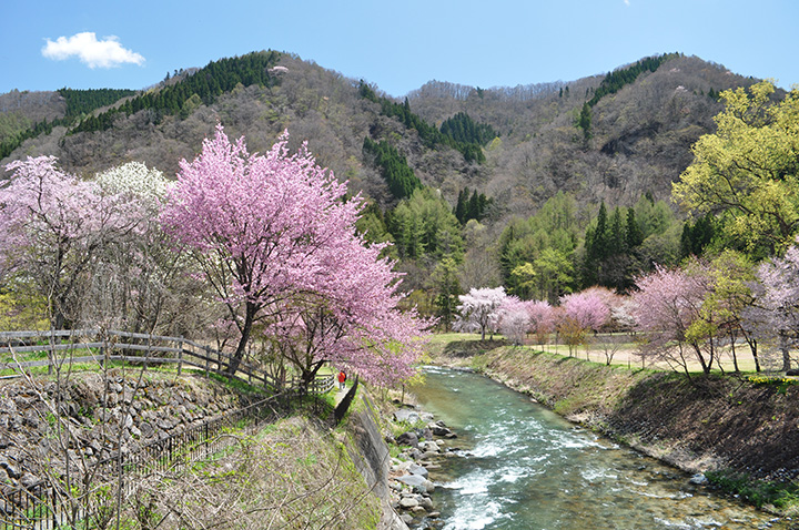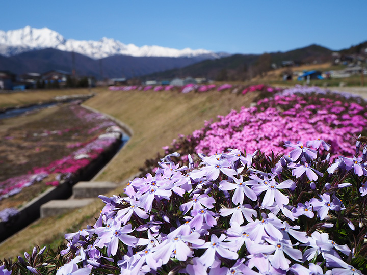 在御町市東側,農具川的河床位於下願見橋上游。 這裡以粉紅、白色和淡紫色的色調,以及將腳下整個區域染成繽紛色彩的草櫻花,成為熱門地點。 看柴櫻的最佳時間是四月底到五月初。 此外,從滿花到初落,可以欣賞櫻花相當長的時間,這點也很有吸引力。 除了花朵,你還能看到北阿爾卑斯山的壯麗景色,以及殘餘積雪的白色、山川的藍色,以及草櫻花鮮明的漸層,形成如同一幅畫般的美麗對比。 五月底,你也可以欣賞鳶尾花和杜鵑花。