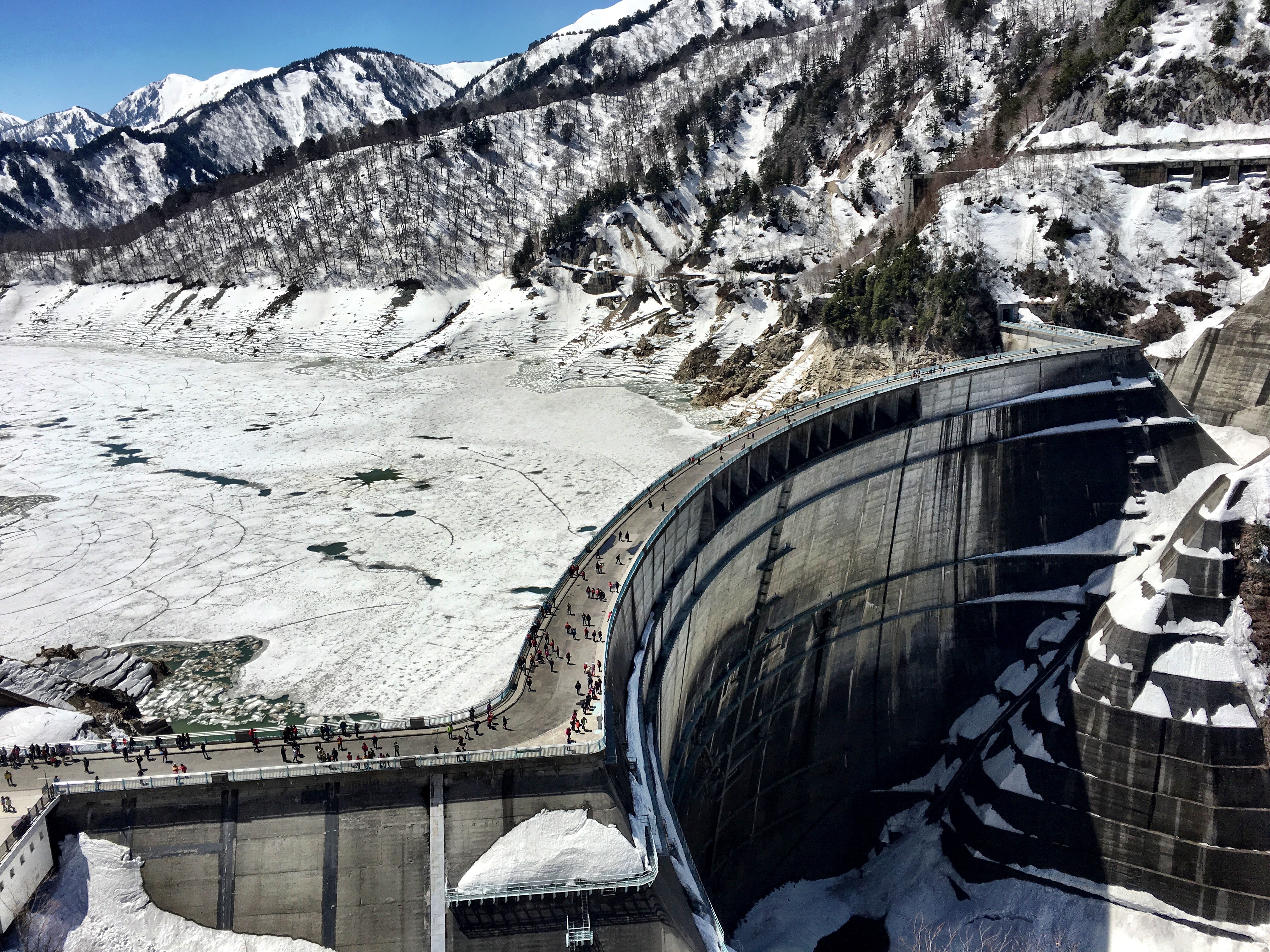 這座拱形圓頂溢流壩幾乎位於長野縣和富山縣的交界處,擁有日本最高的高度。 周圍環繞著海拔3,000公尺的山脈,即使在觀光旺季開始的4月中旬,雪景也一覽無遺。