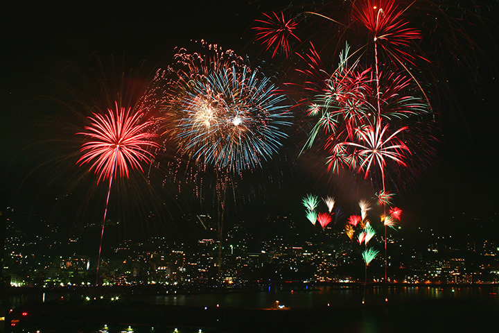 「熱海海上煙火祭」是一場可以說是熱海的煙火祭典,不僅在夏季舉行,全年皆有舉辦。 煙火不僅在夜空中綻放,也在水面上美麗地倒映。 由於三面環山的特殊地形,發射聲比平常更為震撼,讓整個過程更具動感。