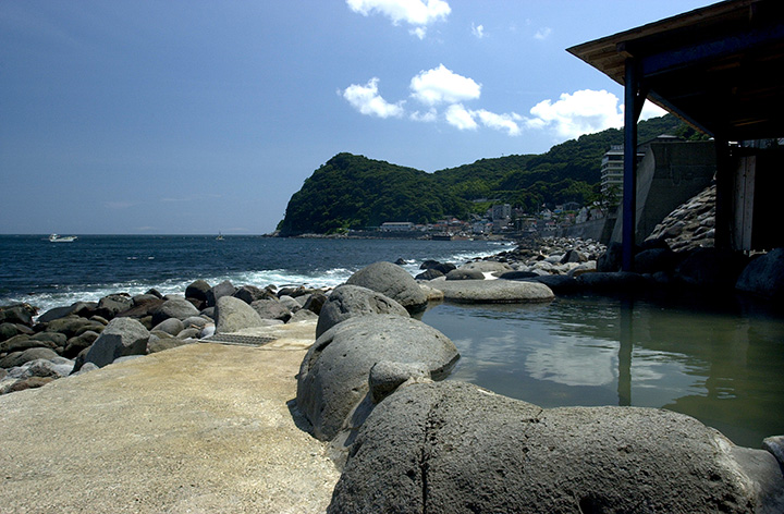 海岸線上的一站是位於北川溫泉的質樸「黑音岩浴場」。 這是一座位於東伊豆海岸、海拔0公尺的公共露天溫泉。 完美的地點,眼前是海洋,遠方是伊豆大島。 沐浴時聆聽海浪的聲音,充滿了開放感。 根據縣令,該浴室於2017年7月重新開放,並成為男女分開的浴室。 即使翻新後,離海的距離當然沒變。 距離波浪邊緣約5公尺,視天氣而定,可能會有波浪濺起的水花。 泉水品質屬於自由流動的氯鹽泉。 神秘的日出沐浴在晨曦升起、映照海面時很受歡迎,但有時你也會覺得自己與蔚藍大海融為一體。