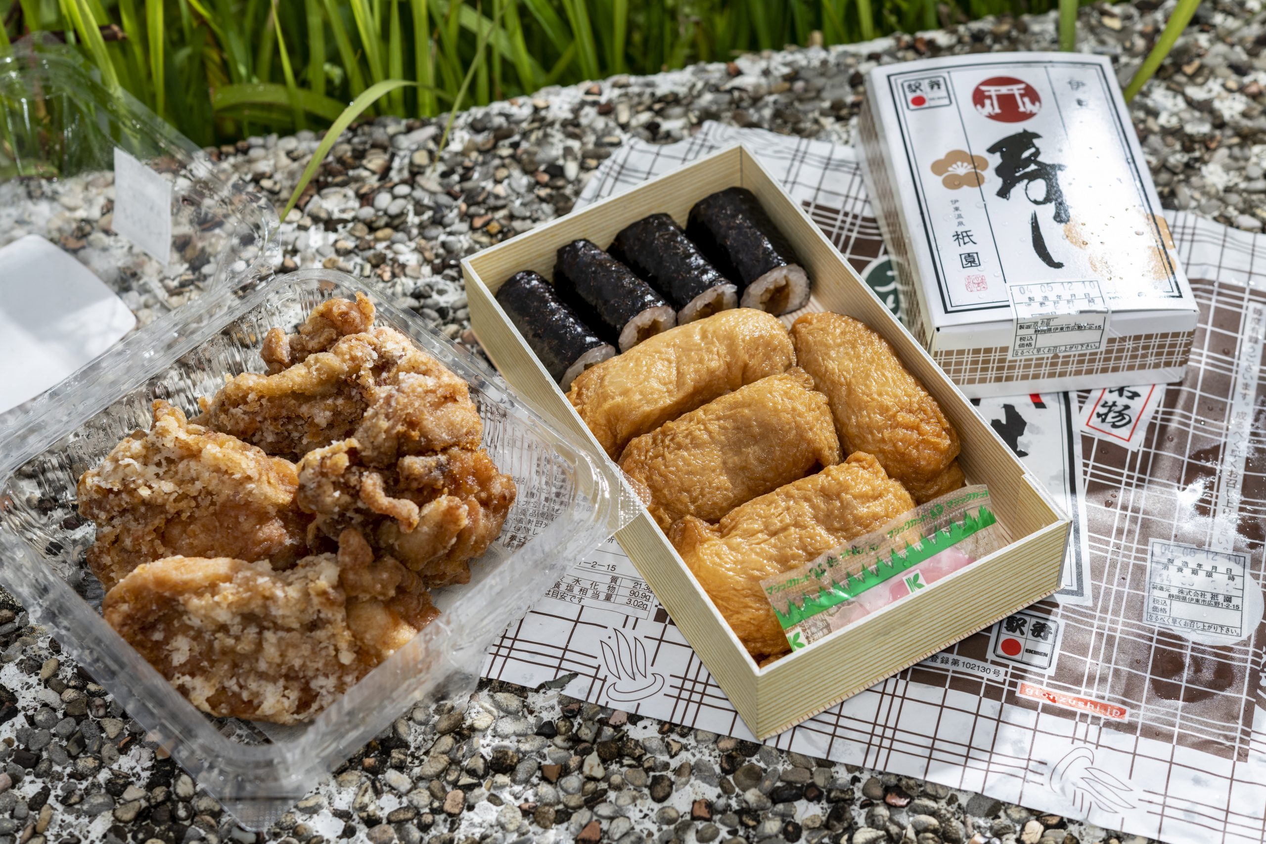 右起:「稻荷壽司 3 貫」480 日圓 「稻荷海苔卷拼盤」940 日圓「祇園之炸雞 4 貫」960 日圓