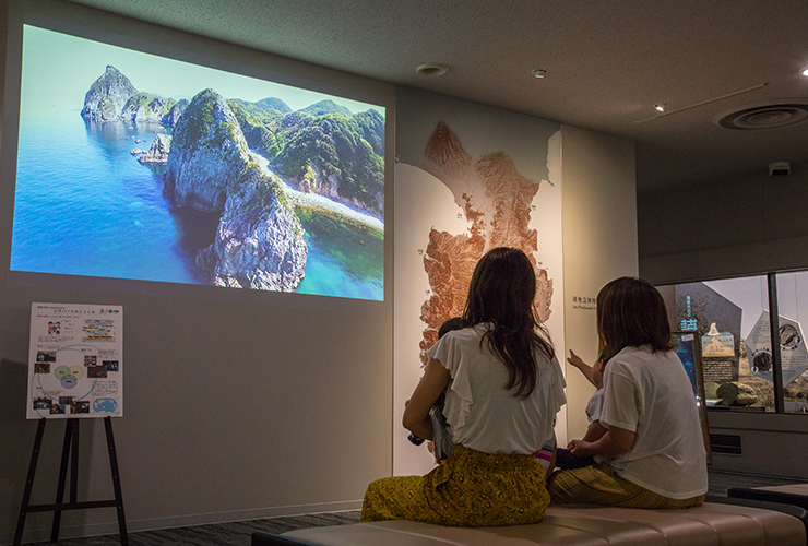 進入入口後,您可以先前往“伊豆半島起源劇場”,大約7分鐘即可欣賞到伊豆的起源。 為了了解更多關於伊豆土地的歷史,我們推薦位於建築物中央的「投影映射」。 影片投影在伊豆半島的立體模型上,展示了伊豆半島從大約兩千萬年前還是海底火山群開始是如何形成的,還介紹了散佈在伊豆半島地質公園各處的大量地質景點,稱為地質遺址。 此外,還有可以觸摸從伊豆各地採集的岩石的展示角,以及可以再現和觀察河流侵蝕機制的模型,都值得一看。 此外,伊豆半島地質公園獨有的商品,如以伊豆地質構造設計的原創手巾和相關書籍,也在店內很受歡迎。