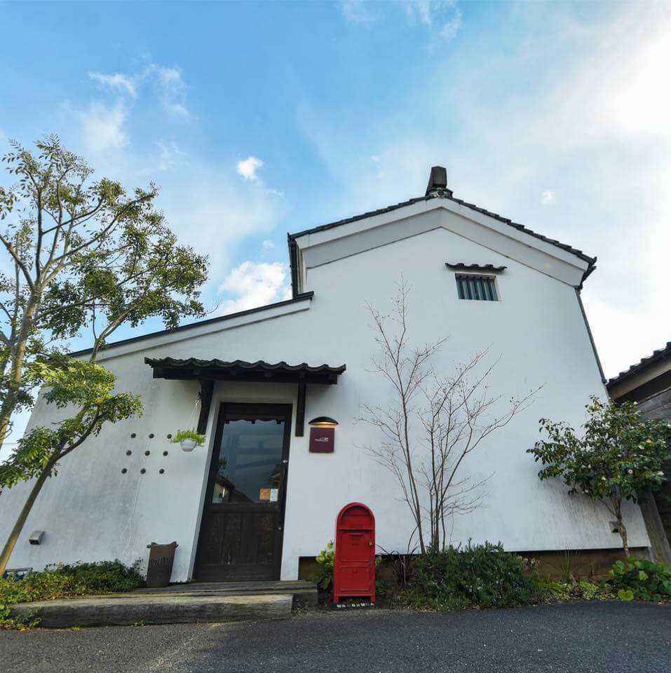 這是一棟古樸的建築,由一座位於出雲大社門戶鎮僅短街的舊私人住宅改建而成,露天露台上有一棵藍色陽傘作為標誌。 餐廳內部寧靜,帶有一絲溫暖的氛圍,是你可以在餐桌和沙發座位上享受放鬆咖啡時光的空間。
