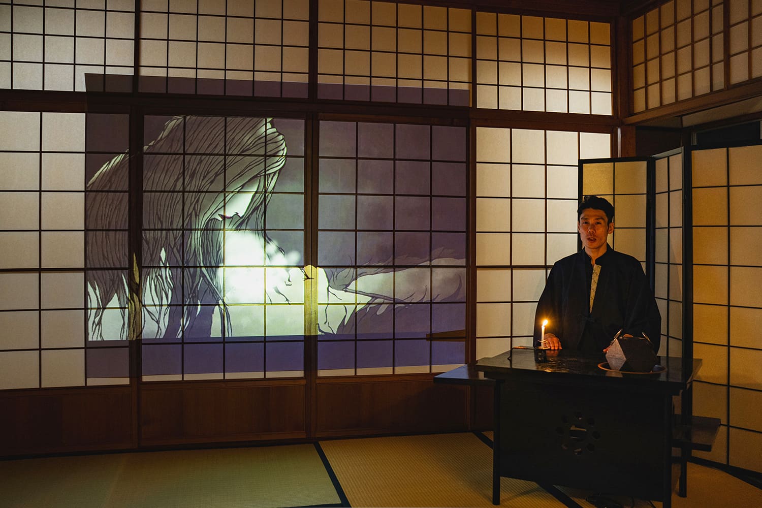 當晚的趣味活動是在飯店的茶室舉辦的「鬼故事茶室」。 首先,會先介紹八雲的生活以及創作《鬼故事》的背景,接著是《雪女》和《無耳義一》的原創影片指導,邀請你進入八雲編織的鬼故事世界。