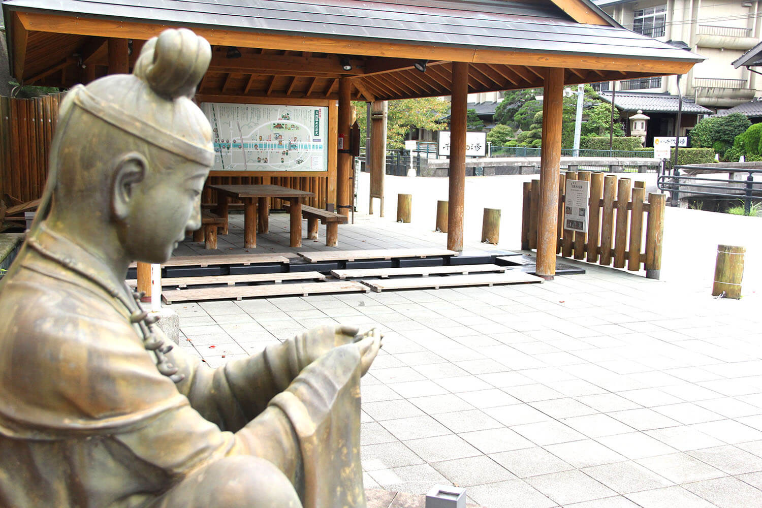換上浴衣後,我立刻開始走路。 前往「姬神廣場」,那裡有免費使用的有蓋腳浴,還有象徵美麗的「姬神藏雕像」。 這裡是可以輕鬆享受玉造溫泉的地方,預計會帶來美麗的肌膚效果。 腳浴毛巾(JPY100)也有無人看管的,讓你可以空手而回。 公主神像前設有相機架,你可以與雕像一同拍攝紀念照。