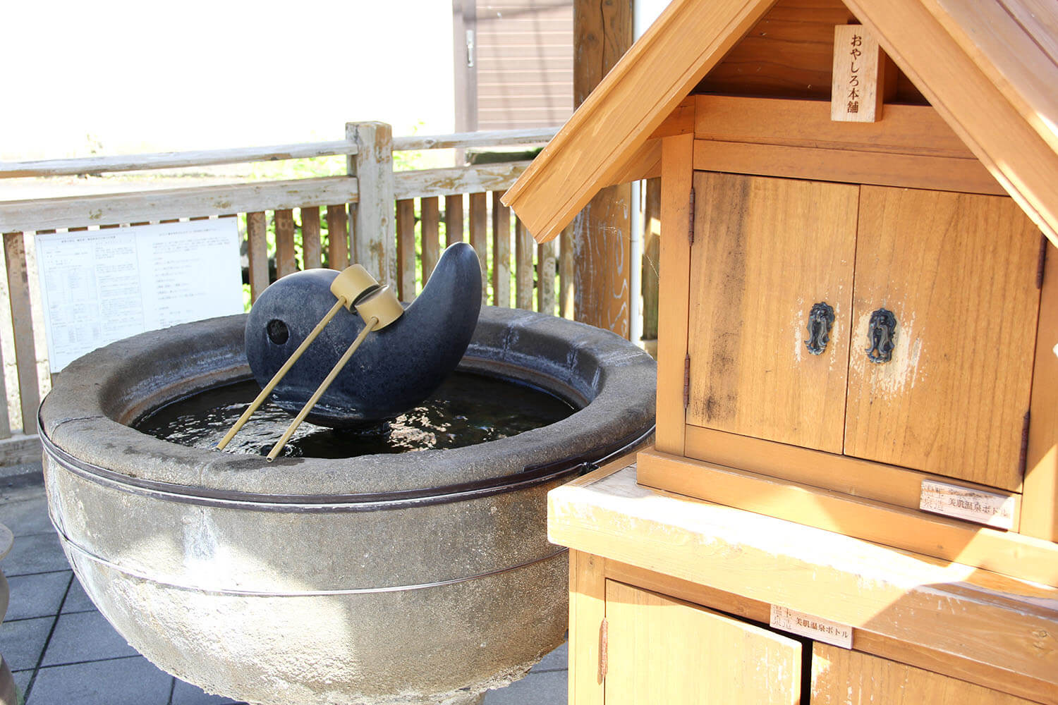 接著,我們從「依理宗」走了大約3分鐘到那個地點。 這是一個方形,設有大型「浴池」,上面安裝了勾玉。 你可以隨意用杓子帶回家湧出的泉水,這在當地人中很受歡迎。 浴缸旁有一款噴霧型「美膚溫泉瓶」(JPY200)無人看管,噴水瓶中溫泉水噴在手和臉上,還能帶來保濕效果。