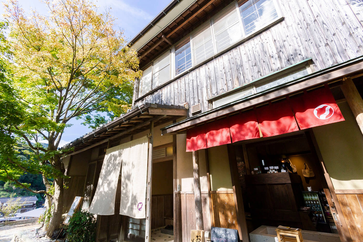 紀念品店位於「竹林階梯」旁,從溫泉町停車場通往大音信川。 該建築是對一棟超過50年歷史的老私人住宅的翻修,作為「鎮警衛」歡迎遊客,同時提供旅遊資訊。