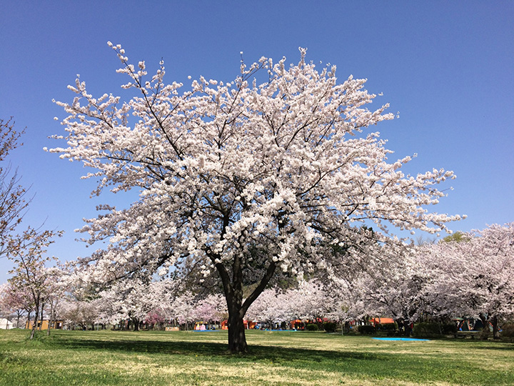 推薦的觀景點是草坪廣場。 周圍環繞著櫻花,非常適合賞櫻。 天氣晴朗時,有團體鋪開休閒床單,舉辦宴會,也有人一邊散步一邊賞櫻,氣氛輕鬆。 園區內還有遊樂設施,推薦家庭入住。