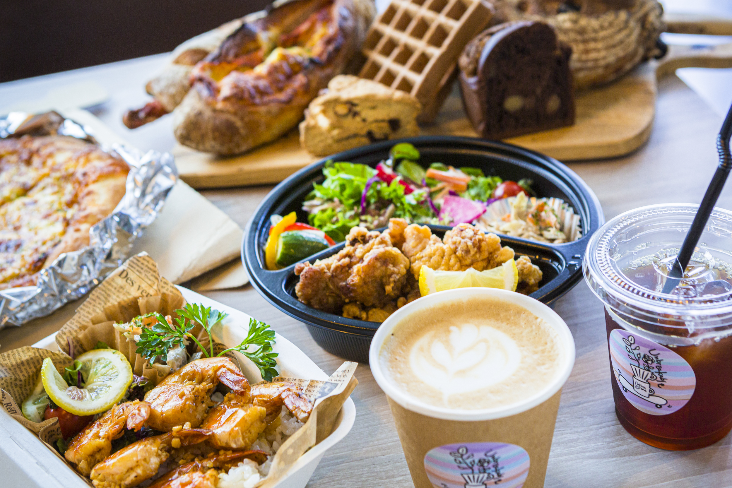 以「咖啡相容菜單」為主題的菜餚,包括每天早上揉製的麵包、炸雞、麗泡飯和披薩等多種類型。