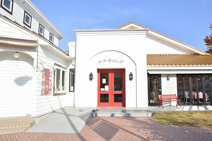 位於住宅區的「甜點店」是一家獨棟店,白色的牆壁和紅色的門給人留下了深刻的印象。 室內裝潢也有效地使用了紅色,給人一種明亮可愛的氛圍。