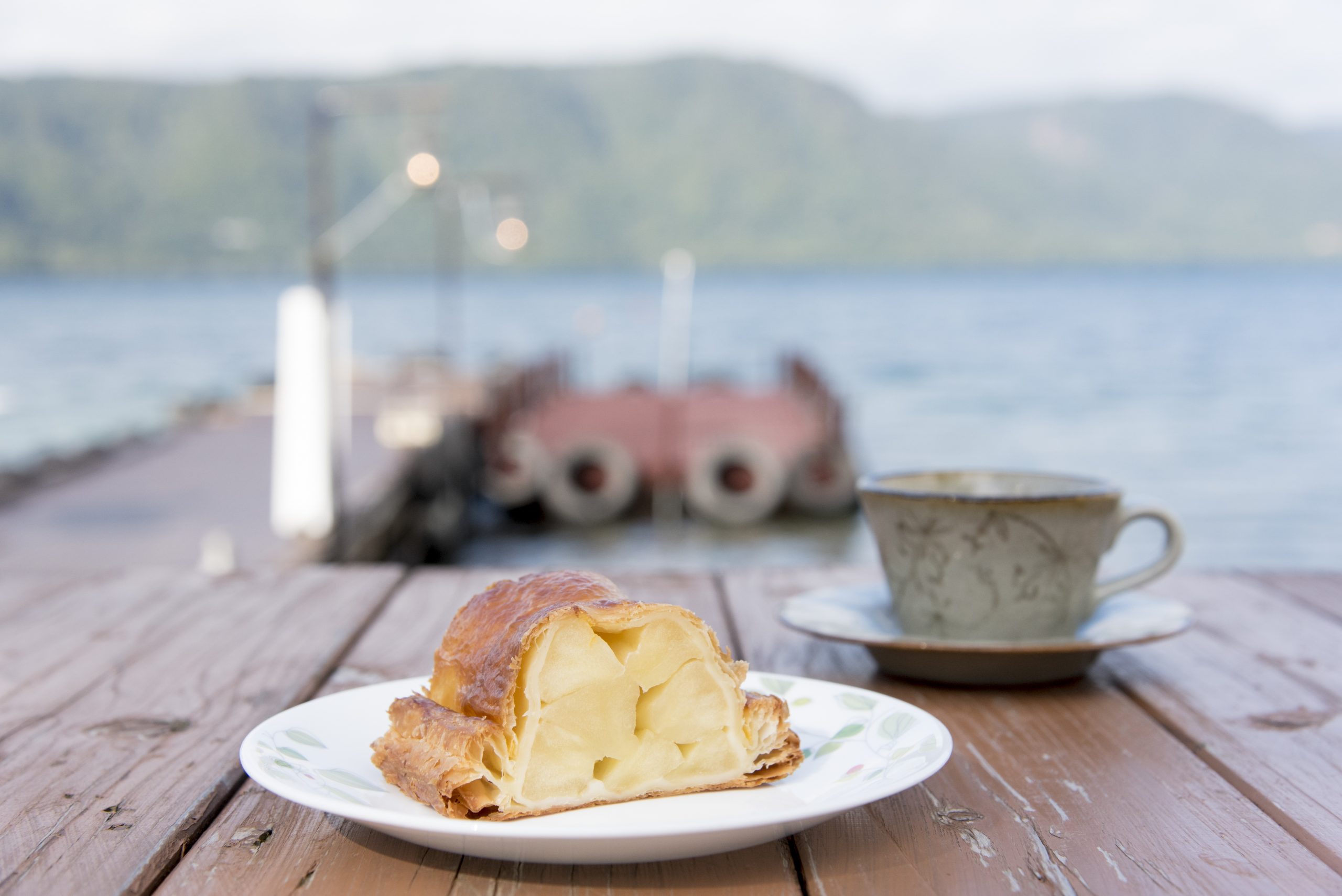遊覽完觀光船後,在湖畔咖啡館休息一下。 它位於青森縣和秋田縣的交界處,以其“手工蘋果派”而聞名。 餡料的蘋果主要是從縣內精心挑選的“富士”。 餡餅裡有很多大塊的蘋果,不使用肉桂,所以可以享受蘋果天然的酸甜。 蘋果派是經過食材選擇、烘焙方法等反覆試驗而誕生的,現在已成為十和田湖的特產。 除了內用外,還可以外帶。