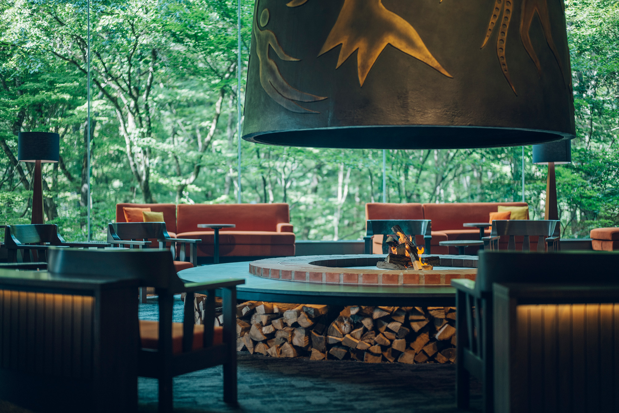 在大堂放鬆時光。 大壁爐「森林神話」生動地表現了鳥類、蘑菇、森林仙女等的生活。