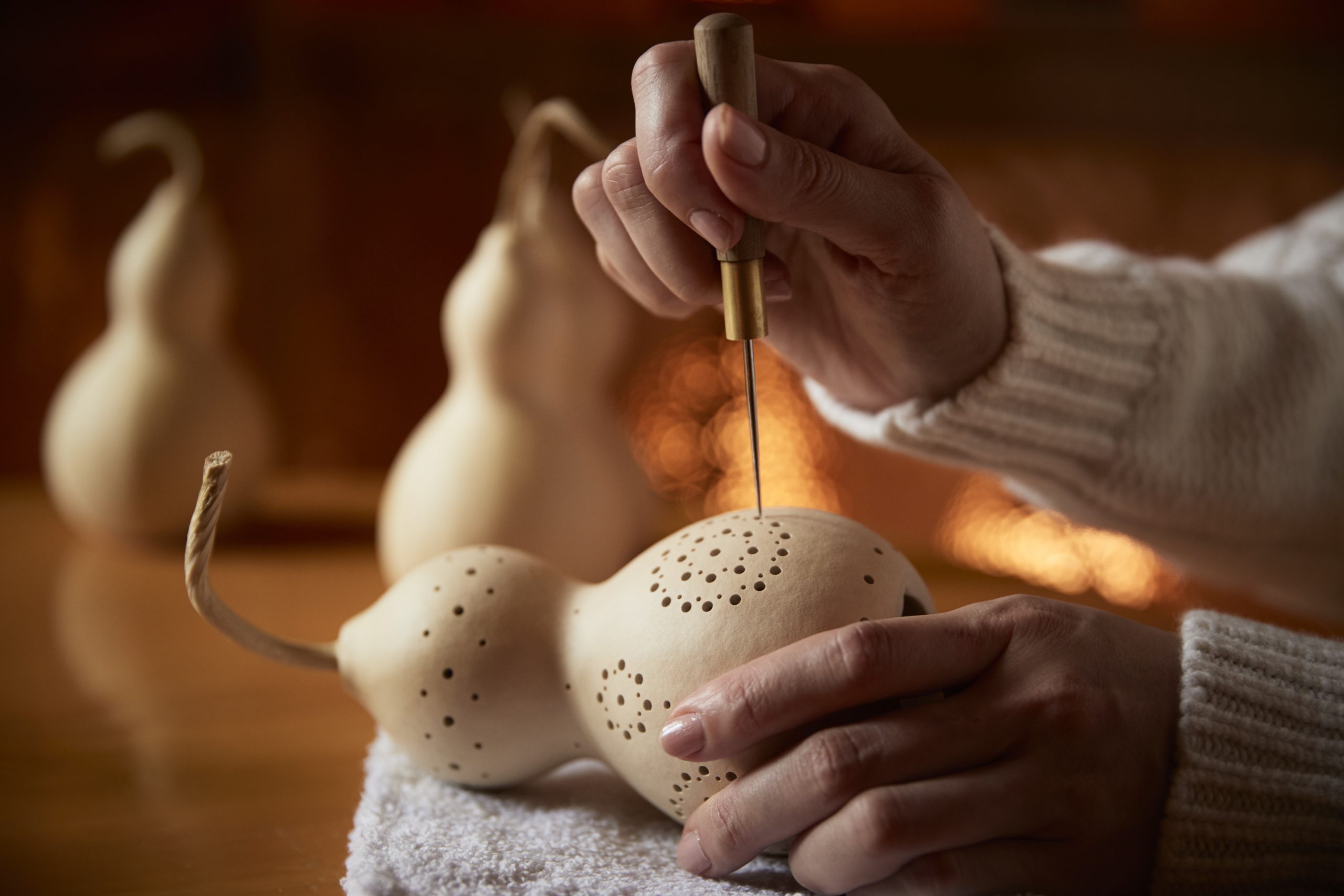 我回到飯店,參加了「花瀨燈體驗」。 你可以自己在葫蘆上鑽孔來做燈。 設計的主題是我在苔蘚三方遇見的獨特苔蘚。 當你打開燈光時,可以營造出一個絕佳且溫暖的空間。