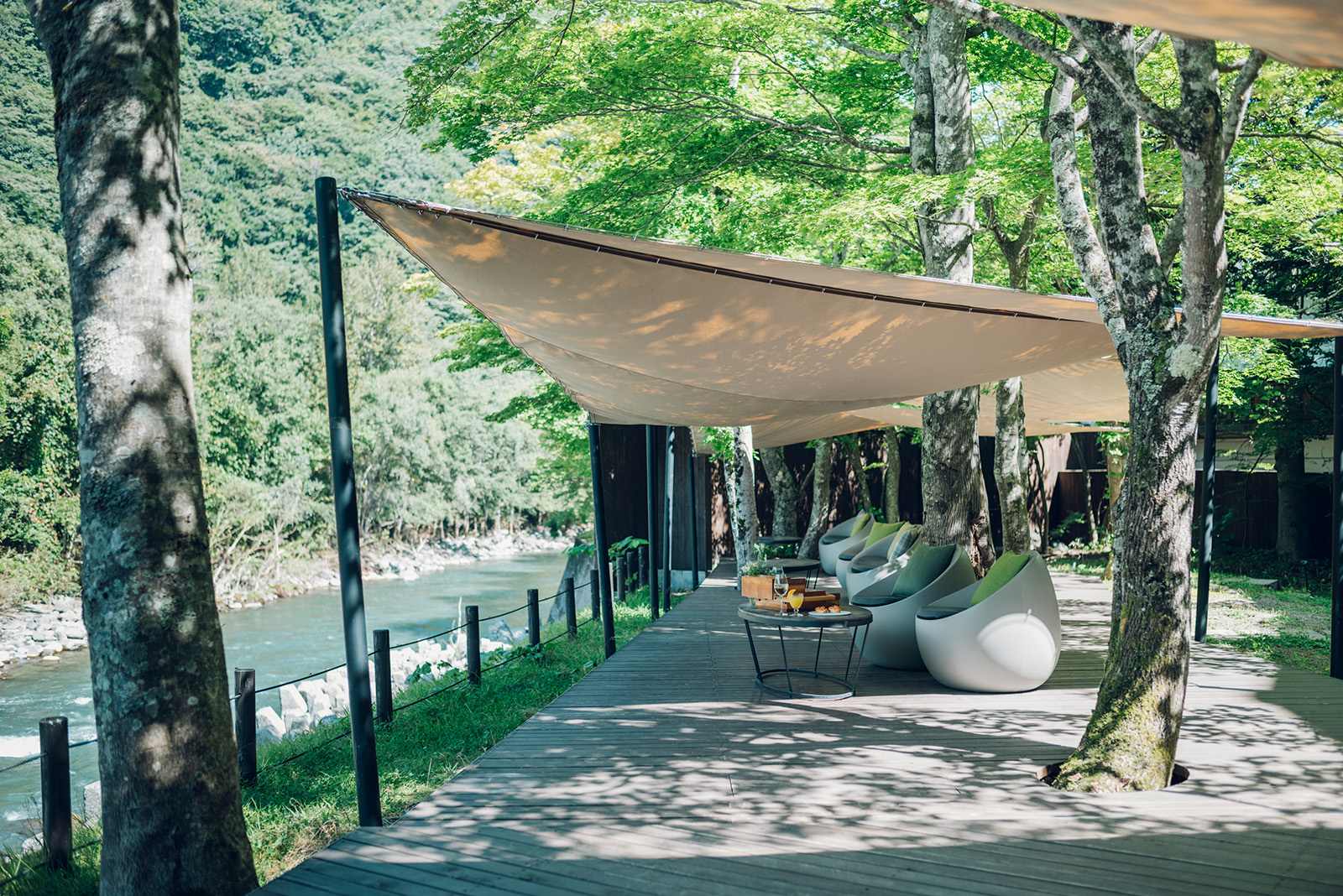 最後一天的早餐是在山澗露台上享用的,昨晚我在那裡享用了開胃酒。 您可以在陽光透過樹林照射進來,河水輕柔的潺潺迴響的空間中度過優雅的時刻。