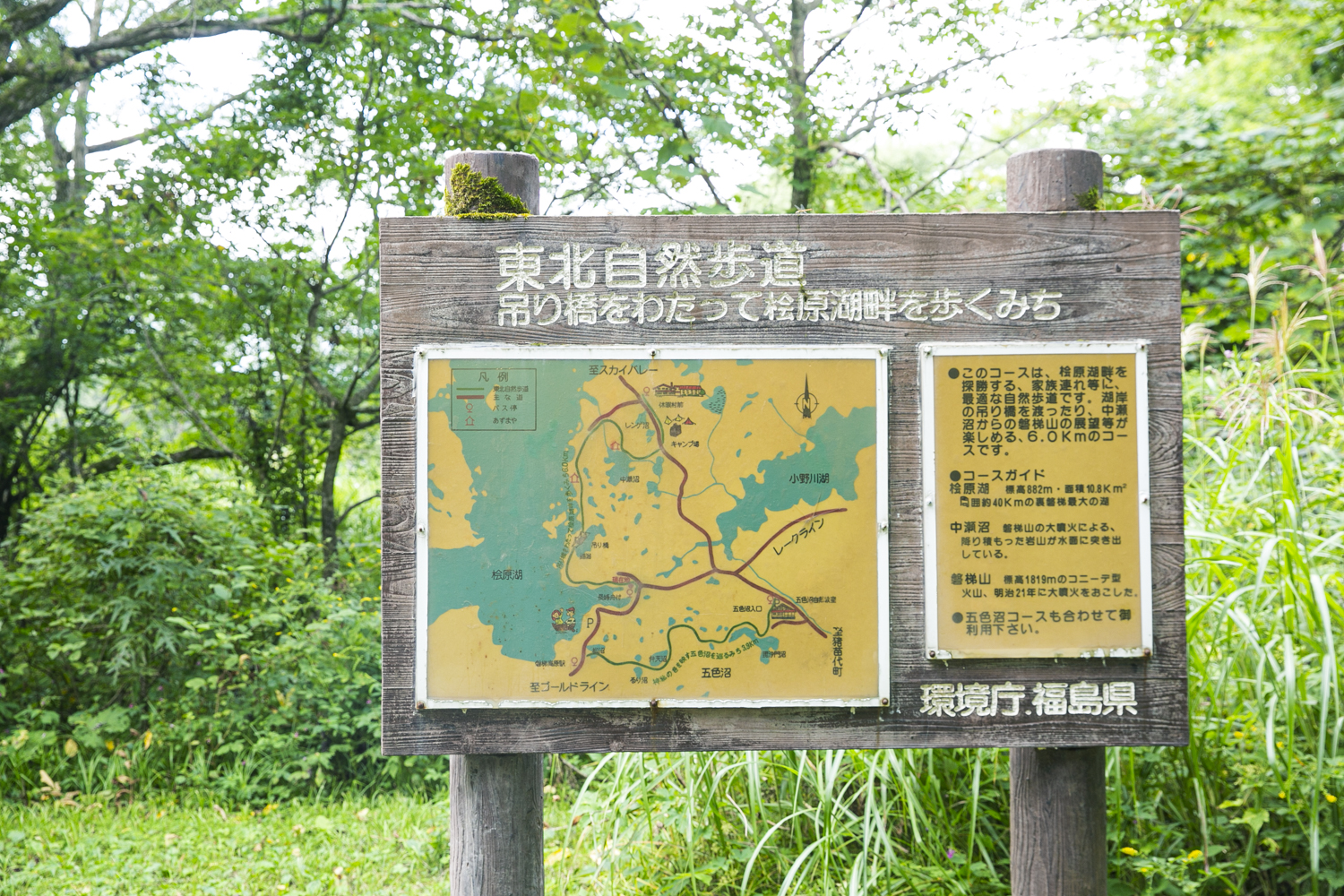 在東岸的湖畔,還有一條名為「東北自然步道(新奧窄道)」的風景小徑。 約6公里的路線還設有中瀨沼,周圍環繞著吊橋和箱形花園等美麗的森林,多變的風景是一大亮點。 沿途還散佈著露營地,您可以在那裡享受湖浴和戶外活動。 步道有兩個入口,五色沼一側是“長峰船付巴士站”,“久華村浦裏磐梯”一側距離“站站”僅幾步之遙。 起伏不多,是適合家庭享受的步行路線。