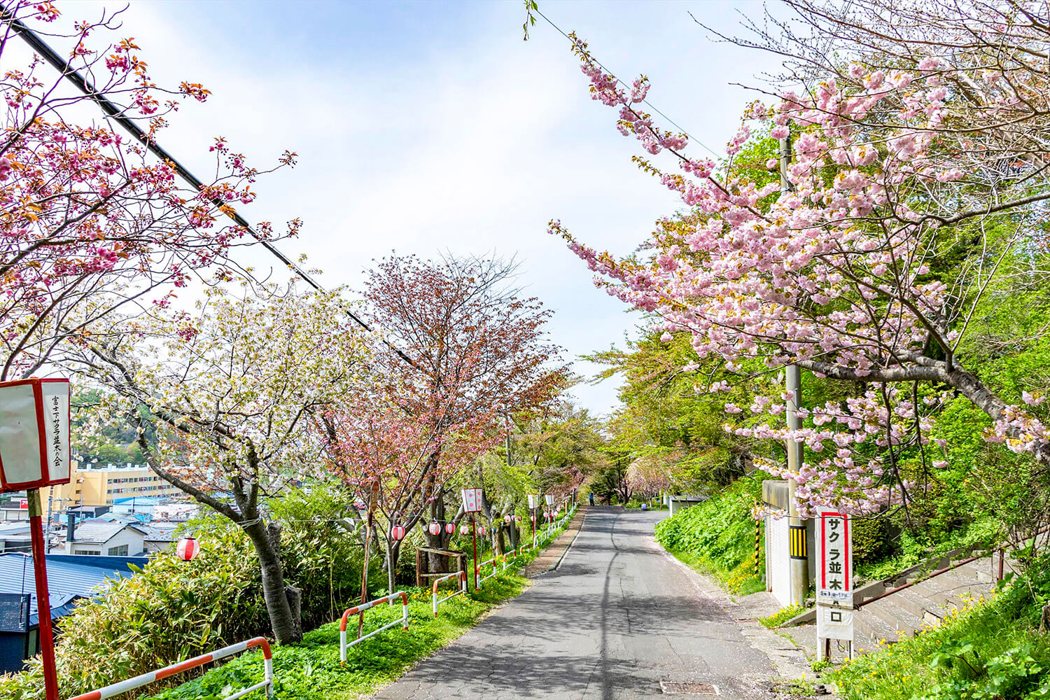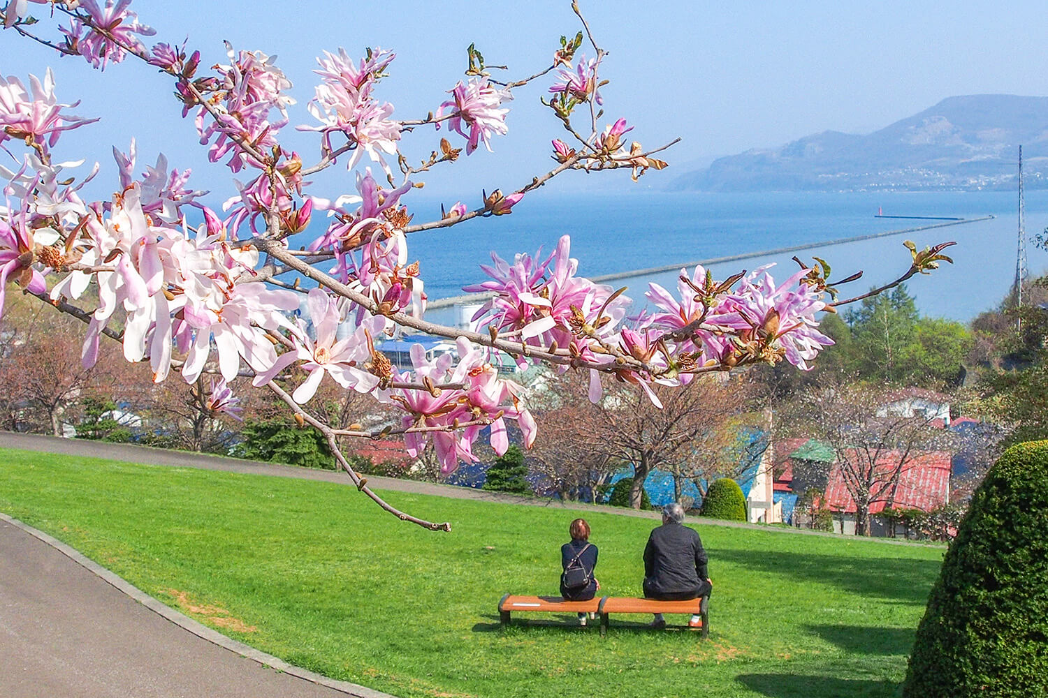根據小樽鎮獨特的坡地地形,從不同角度都能看到富有表現力的櫻花。 離公園停車場稍遠處的彎道是個觀景點,可以看到小樽港在下方展開。 在晴朗的日子裡,櫻花的粉紅色在小樽的藍海與天空中閃耀得格外鮮明,你忍不住放開了快門。