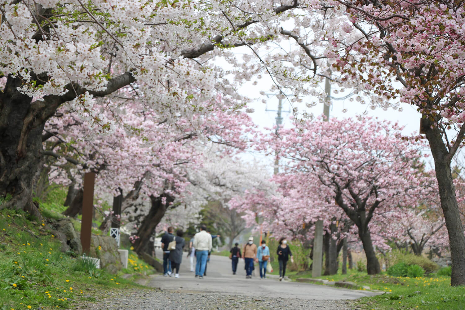 園內約有200棵櫻花樹,以蝦夷山櫻為主,賞櫻季節為5月上旬至中旬。 坐在綠色的草坪上悠閒地看著櫻花在天空中展開固然不錯,但與其他公園相比,這裡有很多高大的櫻花樹,而且花朵被放置在高處,所以從遠處看可以欣賞到更美麗的景色。