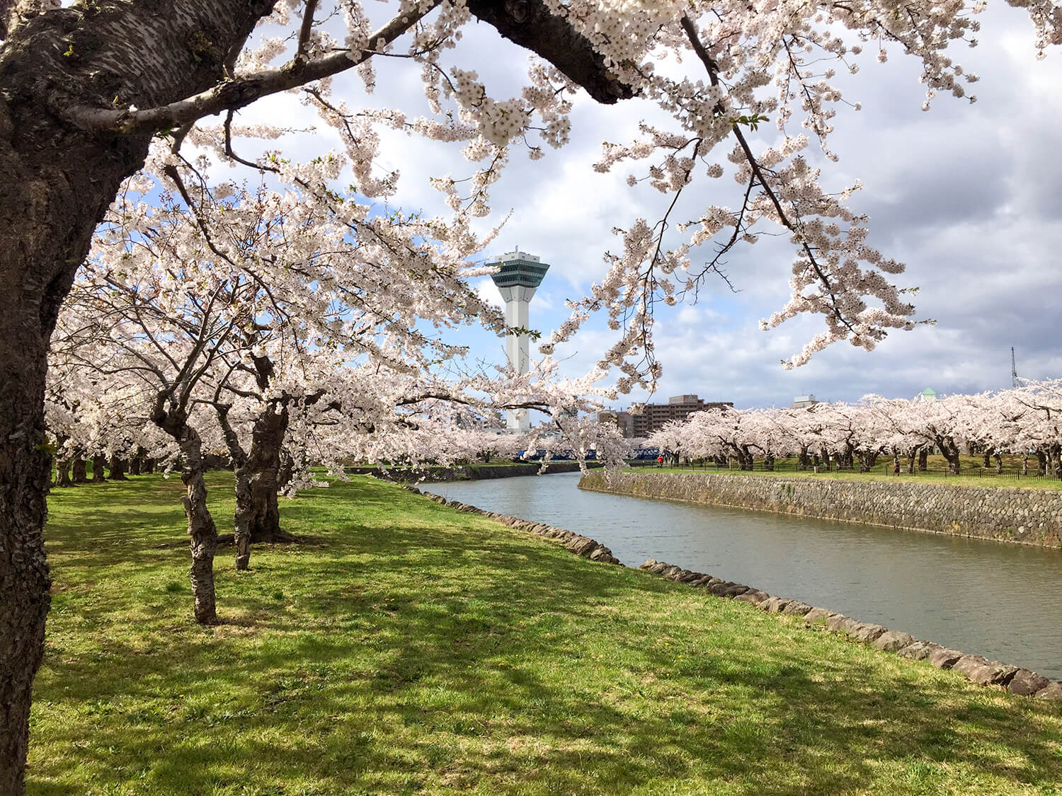 毗鄰五稜郭的「五稜郭塔」是必去的觀景點。 從高90公尺、360度玻璃牆的觀景台上,可以欣賞到櫻花清晰的星形護城河的壯麗景色。 您還可以沿著護城河的長廊漫步,乘坐划艇在水上散步,從各個角度欣賞櫻花。 旺季過去後,散落的花瓣漂浮在護城河的水面上的景色也很美妙。 在4月下旬至5月上旬的賞櫻期間,日落時分燈籠點亮的夜櫻賞心悅目,可以沉浸在櫻花中度過一天。