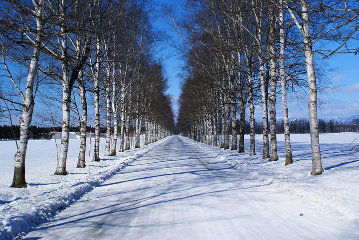 從牧場入口直綿約1.3公里的白樺樹成蔭的道路,是NHK晨間劇《馬山》(2014年)的拍攝地。 嚴冬時節,落葉的白樺枝被霜凍覆蓋,開出了白色的花朵。 純白的道路與藍天形成鮮明對比,非常壯觀,絕對值得拍照留念。