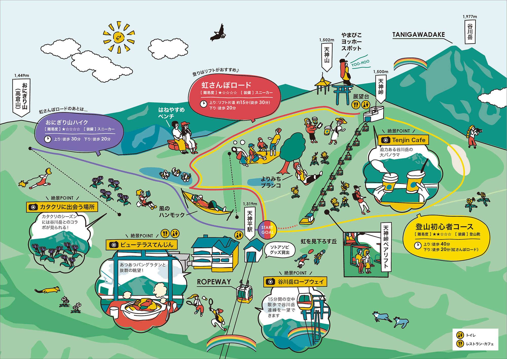 搭乘索道,纜車前往海拔約1,500公尺的天神峠站。 以谷川山為背景拍照,參觀天滿宮和弁財天,然後開始健行。 如果朝有「健行路線(約20分鐘)」標誌的方向走,就會進入草地路線。 穿過兩側有小山脊的山谷,從中間開始,高倉山的景色盡收眼底。 在欣賞繡線菊、金古香、蝦子花等各種高山植物的同時,我們大約20分鐘就到達了「天神平站」。 路線為下坡,冬季用作斜坡,因此有輕微的坡度,根據天氣的不同,可能會泥濘,因此建議腳上穿運動鞋。