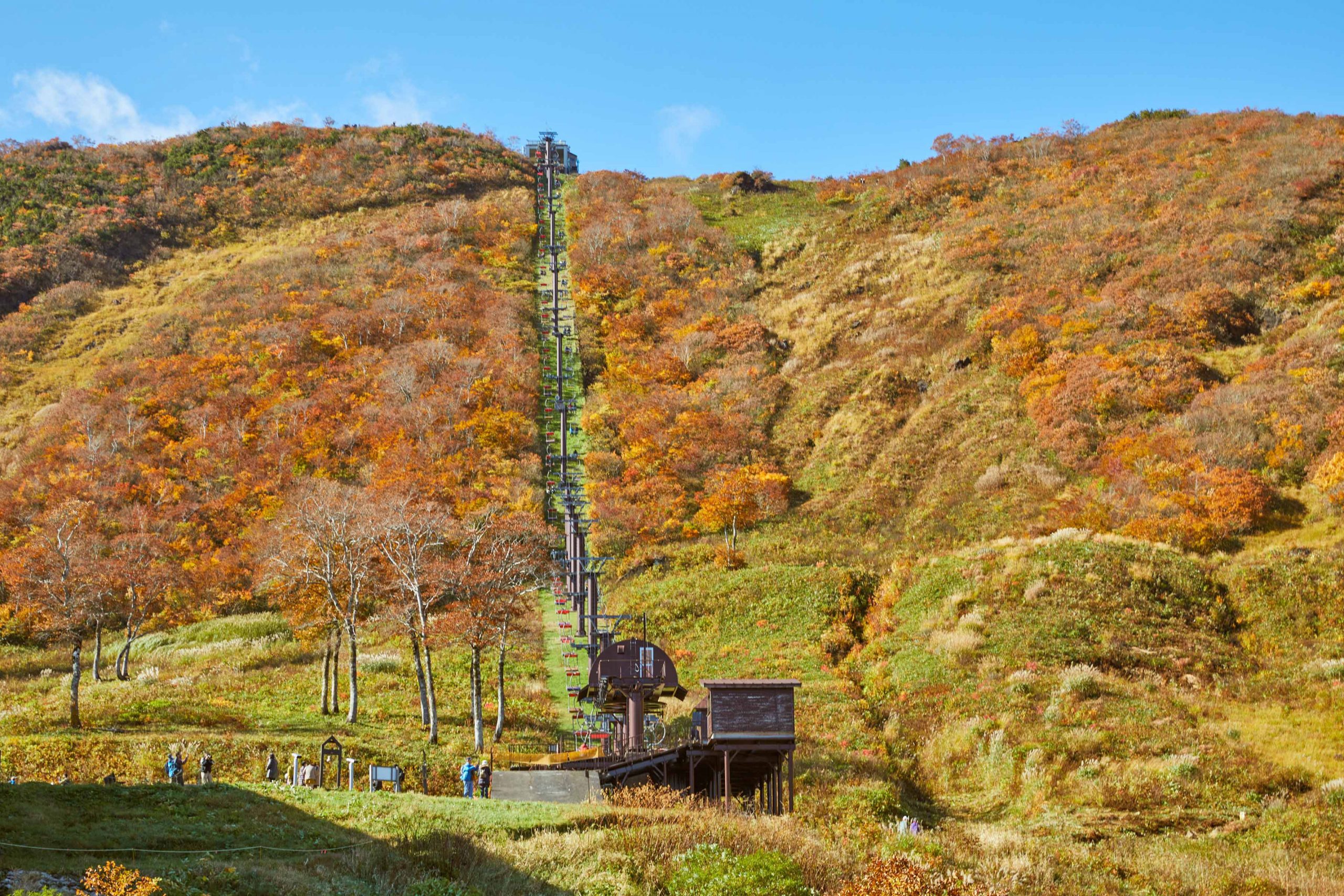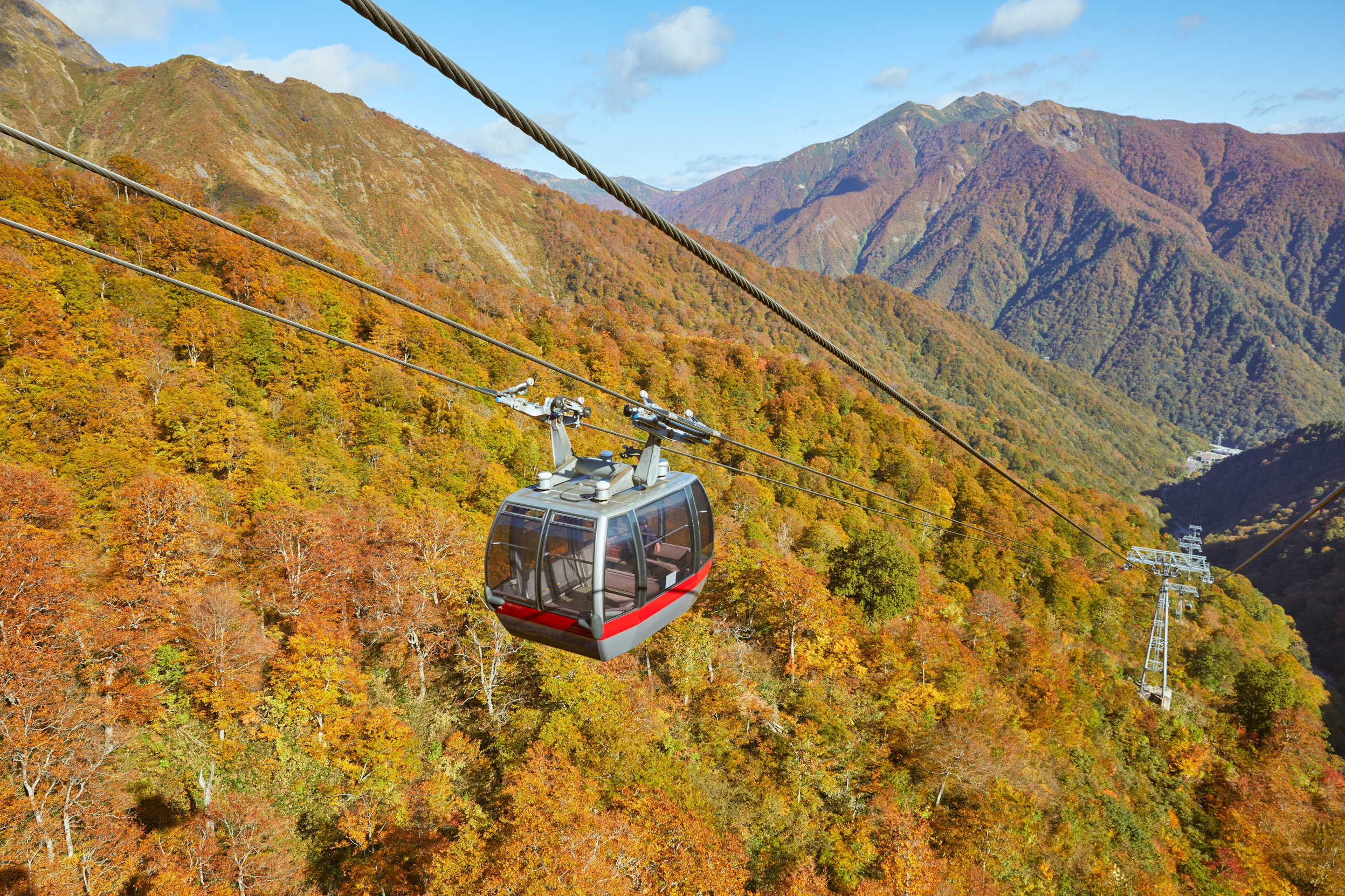 「谷川岳索道」全長2,400公尺。 從山腳下的堂愛口站到山頂的天神平站,爬上約600m的海拔差約15分鐘。 它採用一種稱為Funitel型的風格,其中纜車用兩根繩索和一台短懸掛機懸掛,並隨繩索移動,因此您可以享受抗強風和山區特有的側風的穩定乘坐體驗。 日本只有三個地方使用Funitel系統。 是其中行車距離最長的。