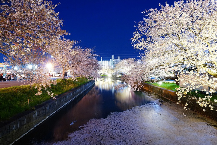 位於土浦市東西兩側的新川是一條流經安靜住宅區的小河。 染井吉野樹沿著河邊排列約2公里,花季河邊會變成淡粉色。 推薦從「新天橋」(距離JR土浦站約1公里)附近的景色,河流變窄的上游景色也絕佳。 兩岸伸出的樹枝形成櫻花拱門,櫻花倒映在河面上,讓您享受櫻花的世界。 景色也很壯觀,燈火通明,花筏上佈滿了散落的花瓣。 您可以充分享受賞櫻的真正樂趣。