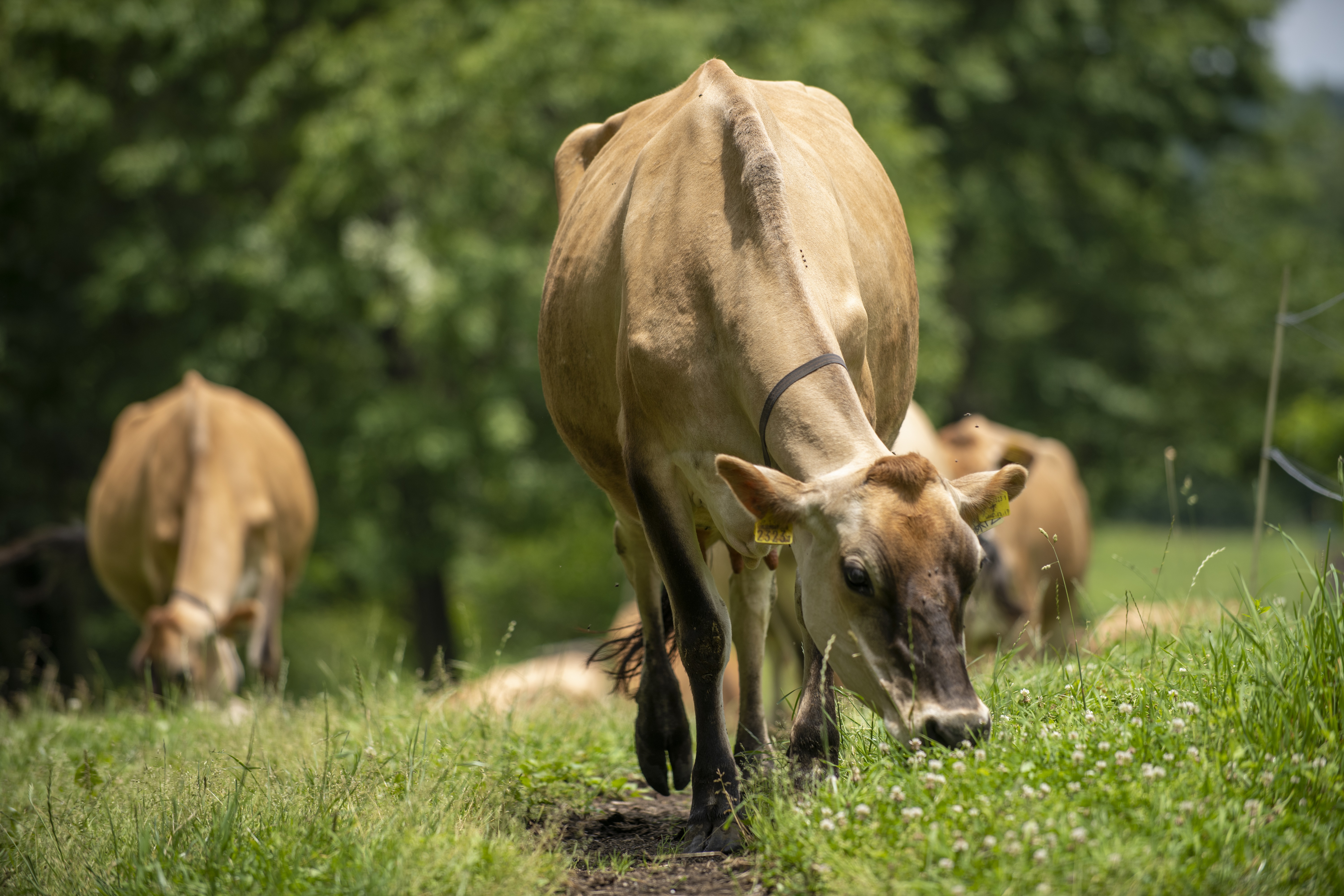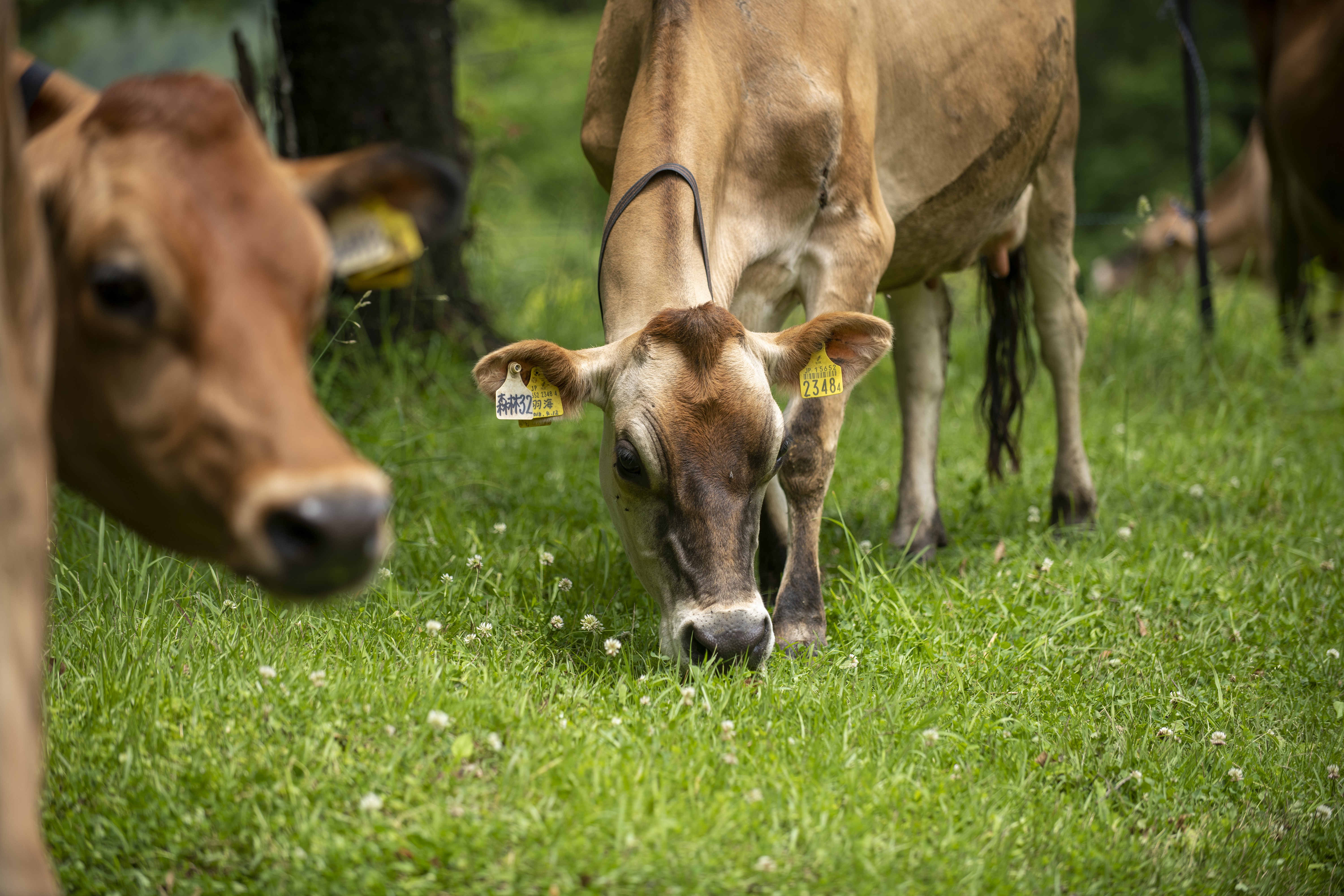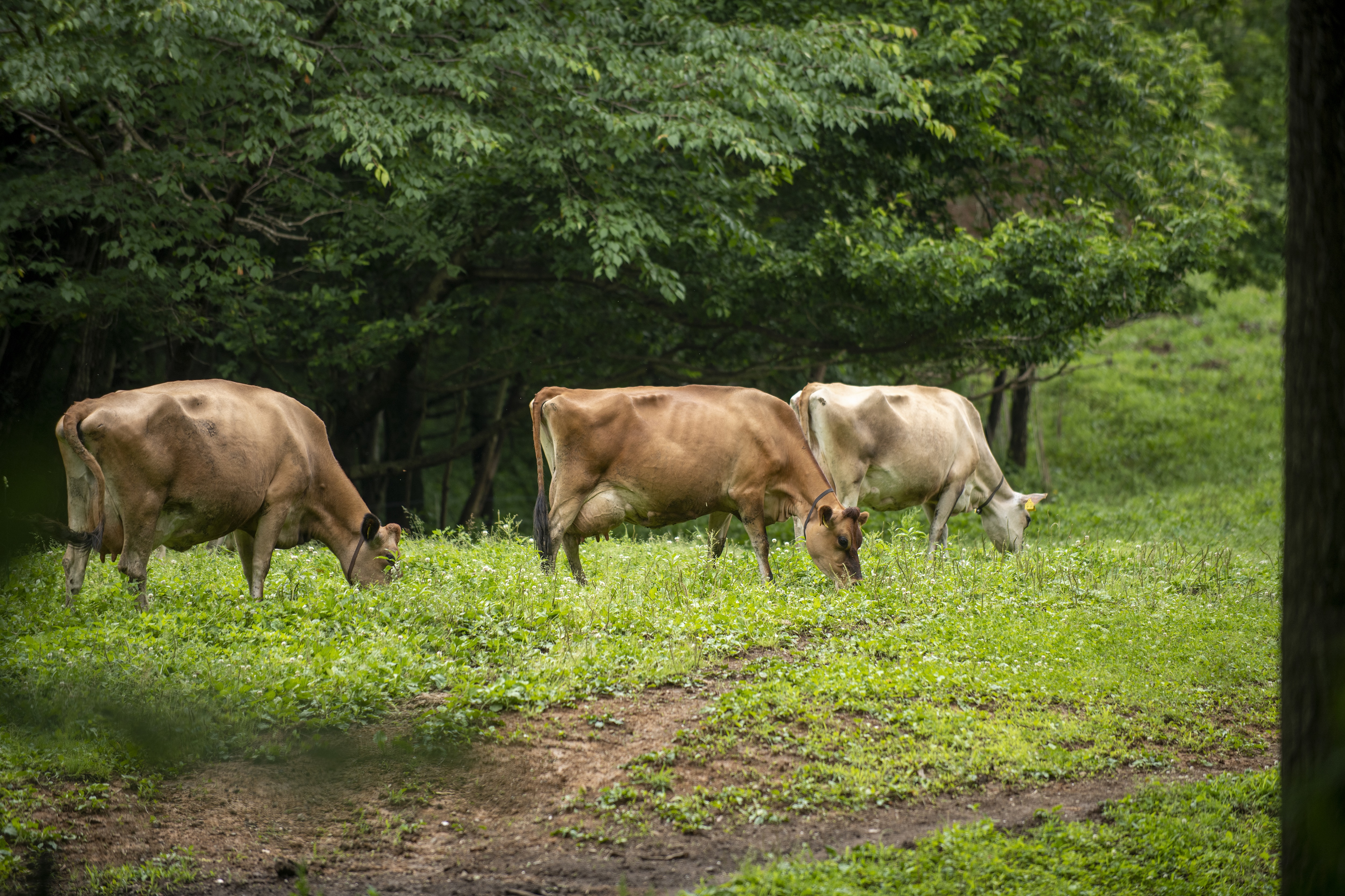 澤西奶牛比其他大型奶牛品種小,非常適合以森林灌木叢為食的放牧方式。 儘管地形起伏,但透過乾淨地吃茂盛的草,陽光到達樹木之間的地表,為小型動植物的生態系統創造多樣性,這對森林來說也是一個很好的結果。 只有一頭牛,才能以這種方式振興森林。 這裡誕生了一個充滿美好事物的循環,其中也帶來了美味的牛奶。