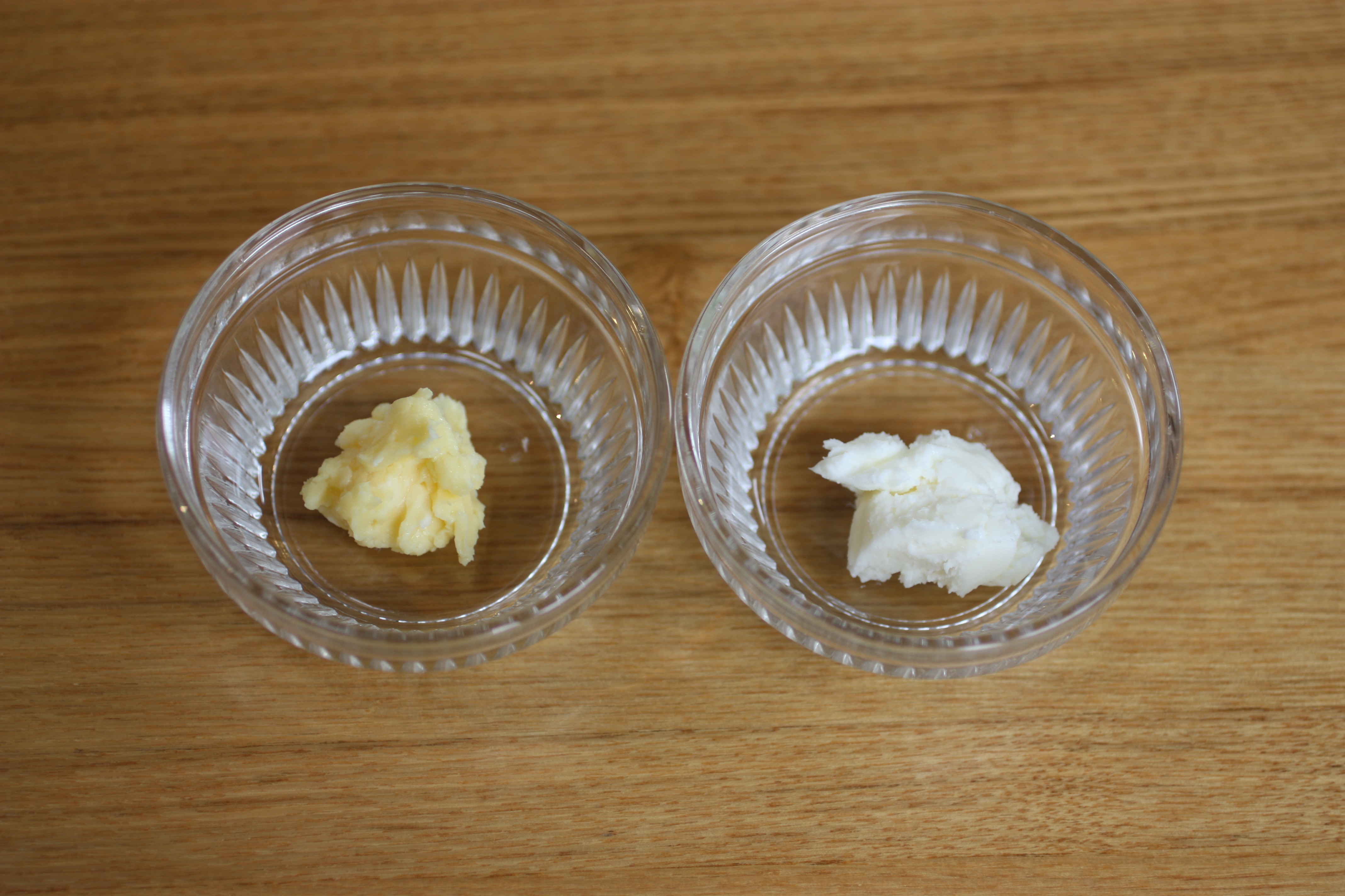 兩張照片都顯示了牧場生產的黃油。 左邊的那個是用春天到秋天榨的牛奶製成的,黃色非常濃,香氣很濃。 右邊的那個是用冬牛奶製成的,顏色幾乎是白色的,味道濃郁。 如果將它們並排比較,您可以一目了然地發現它們會因季節而異。