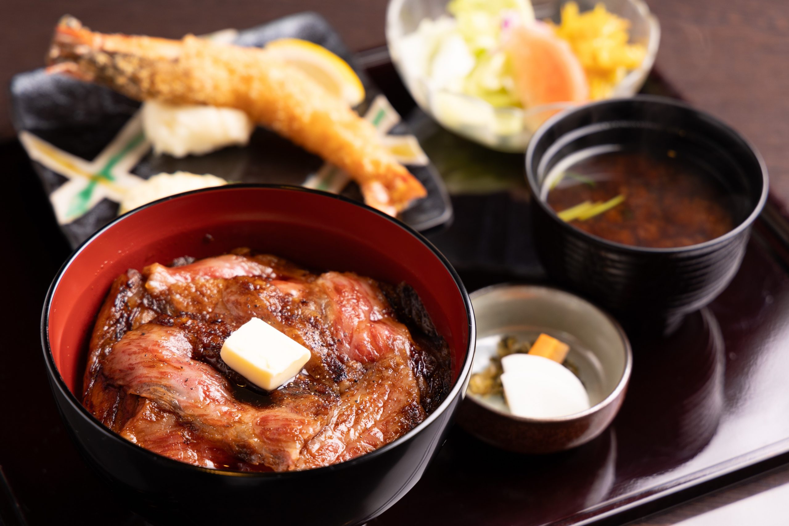 「牛肉鐵丼&蝦仁炸物套餐」JPY3950(僅限午餐)。 沙拉、紅湯、自製新香