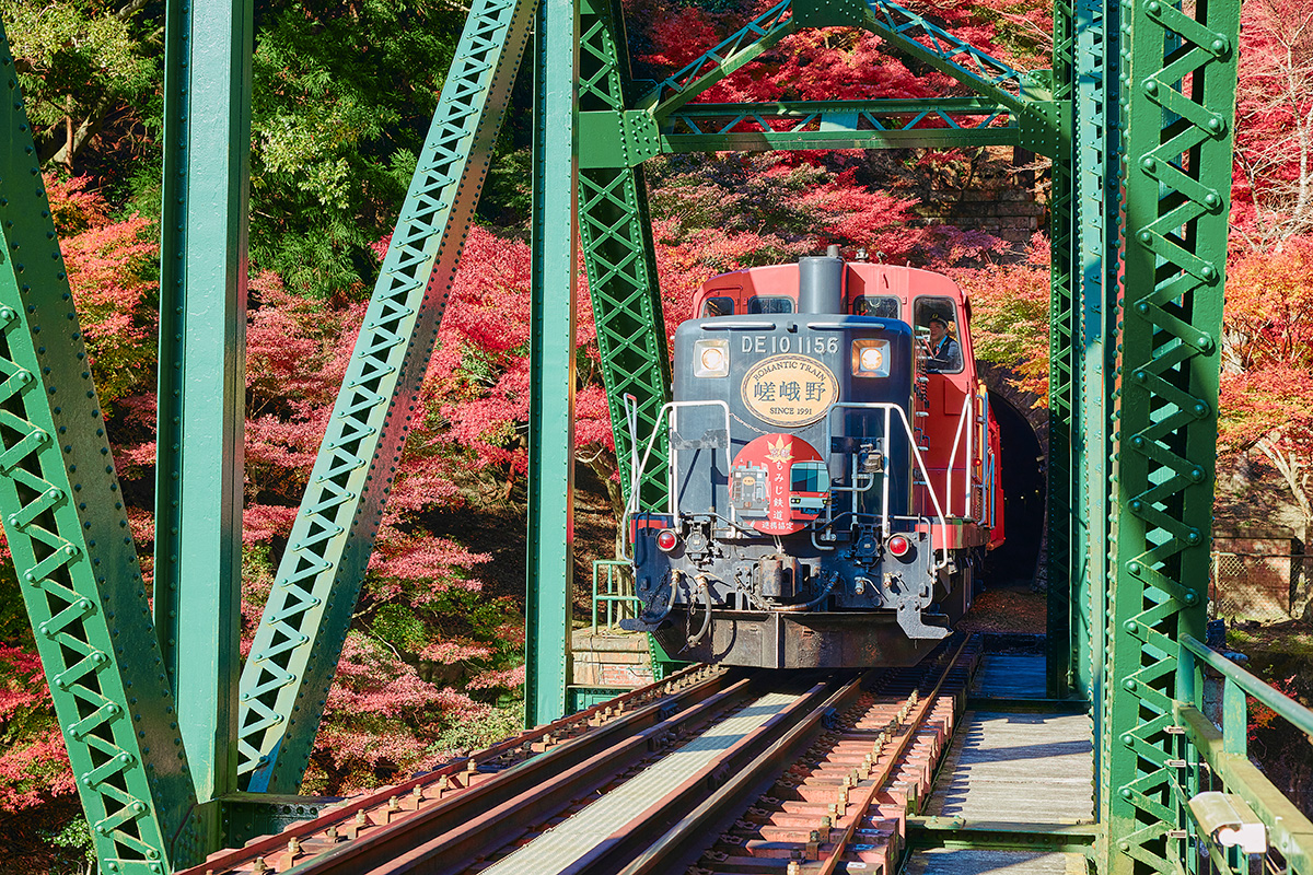流經嵐山旁的穗豆川上游有著名的秋葉,稱為穗頭峽谷。 如果你想在秋天享受穗頭峽谷,我們推薦搭乘佐賀野有軌電車,這是一條沿著山谷行駛的觀光列車。 你可以從京都市一側的起點電車佐賀站慢速行駛約25分鐘,一邊欣賞山谷的美景,前往龜岡市一側的龜岡電車站。