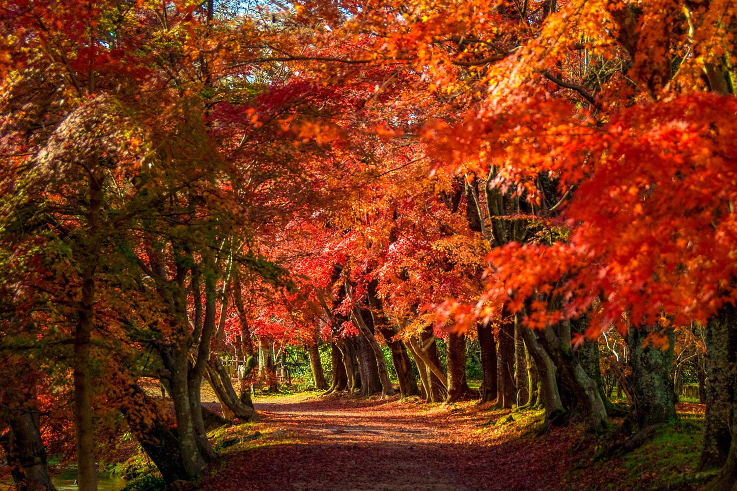 大澤池是各地都可以享受紅葉採摘的地方,但最受歡迎的是從「新京塔廣場」通往「名古曽瀑布遺址」的「楓樹之路」。 鮮紅的楓葉覆蓋了頭頂,沿著花園小徑漫步,彷彿被秋天的紅葉包圍。