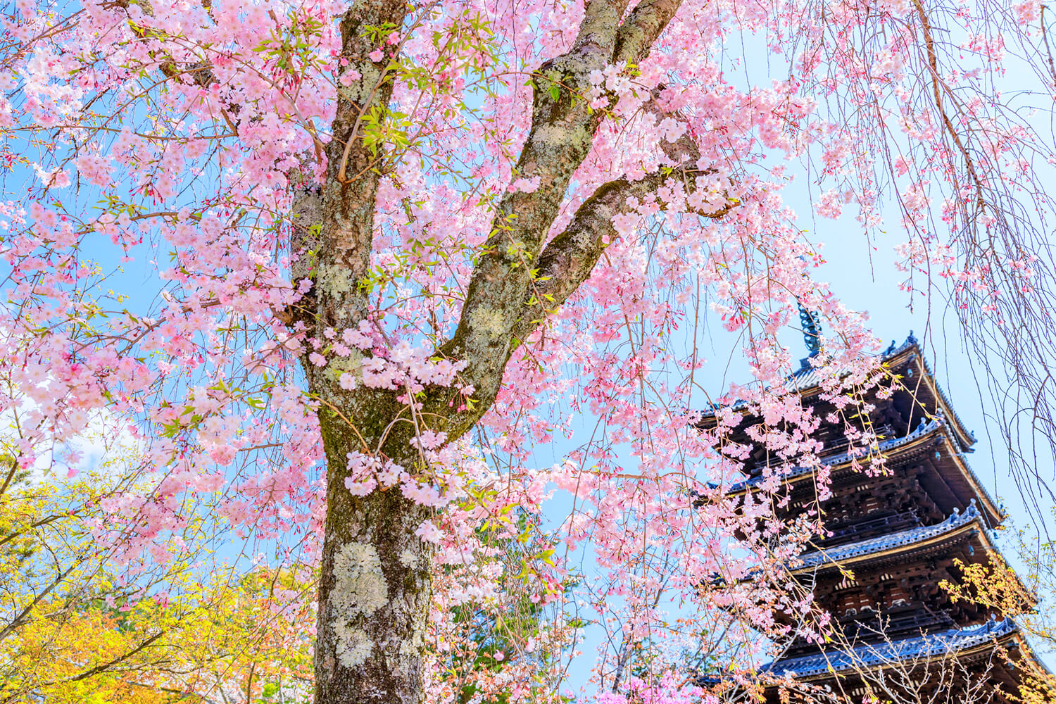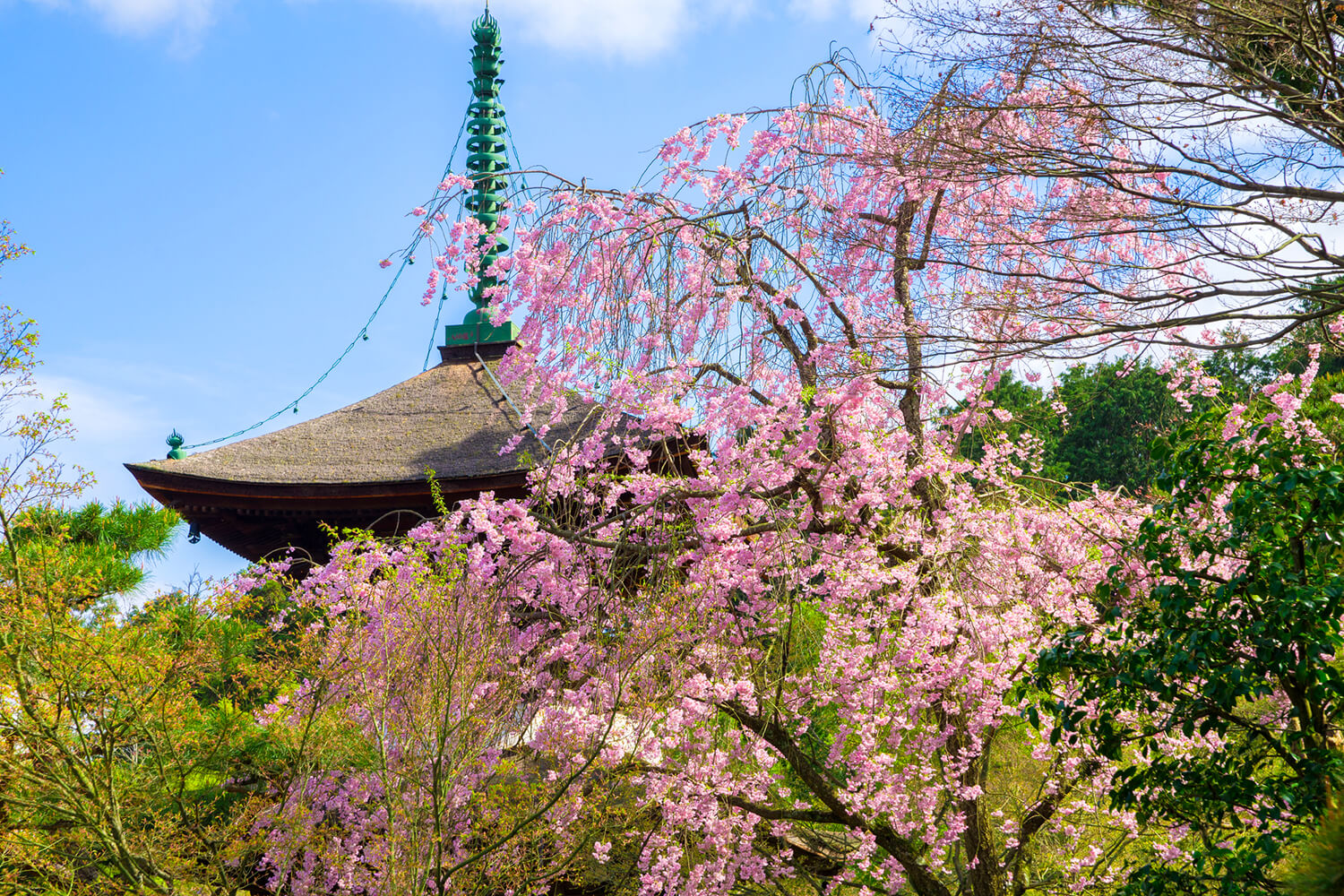 在風景秀麗的小倉山腰上,正殿、多寶塔、倉庫、仁王門等點綴著一座像山紫水一樣美麗的山寺。 春天,山櫻、杜鵑花、杜鵑花、野花等鮮花盛開,小鳥嘰嘰喳喳。 展現在你面前的,是一幕讓人想起這個世界天堂的景象。 仁王門附近的垂枝櫻特別受歡迎。
