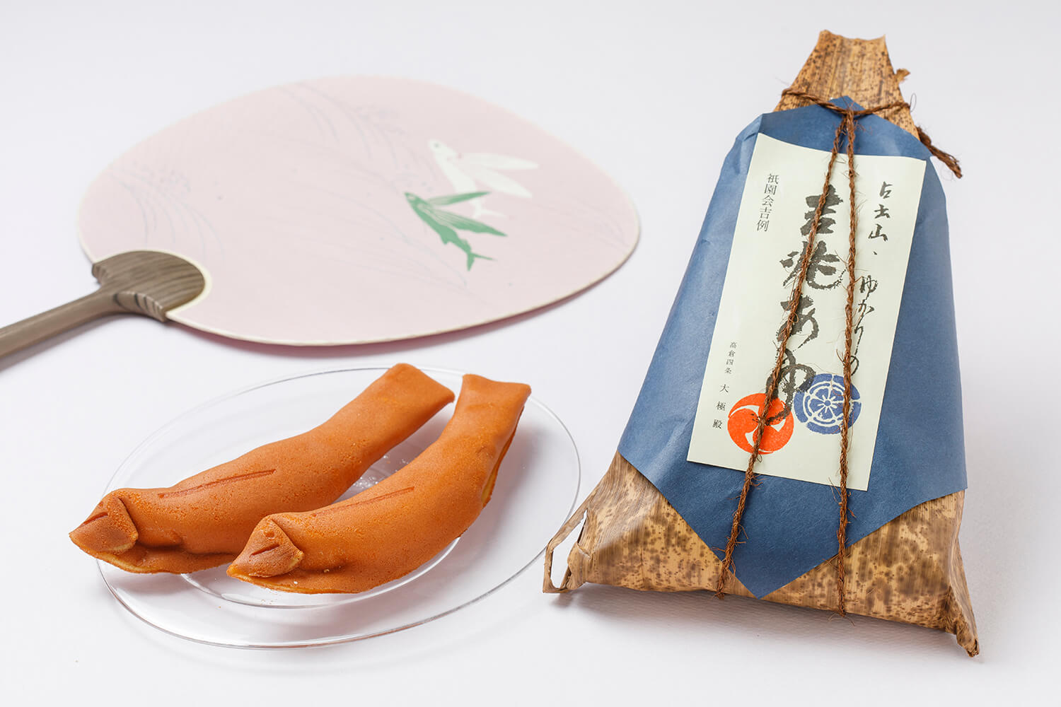 浦出山也被稱為“鮎魚山”。 它來自於傳說,在神仙的舊時代,神宮皇后捕撈香魚並預言勝利。 為了紀念這一點,我們僅在 7 月 13 日至 16 日期間出售名為“Ayu Kichicho”的吉祥糖果。 這是一種被稱為“Wakaayu”的經典夏季點心,是將久日包裹在薄薄的烤蛋糕中製成的。 香魚翹起的尾巴和細長的眼睛也很可愛。 它是由靠近山鉾町的“大石殿本舖”製作的。