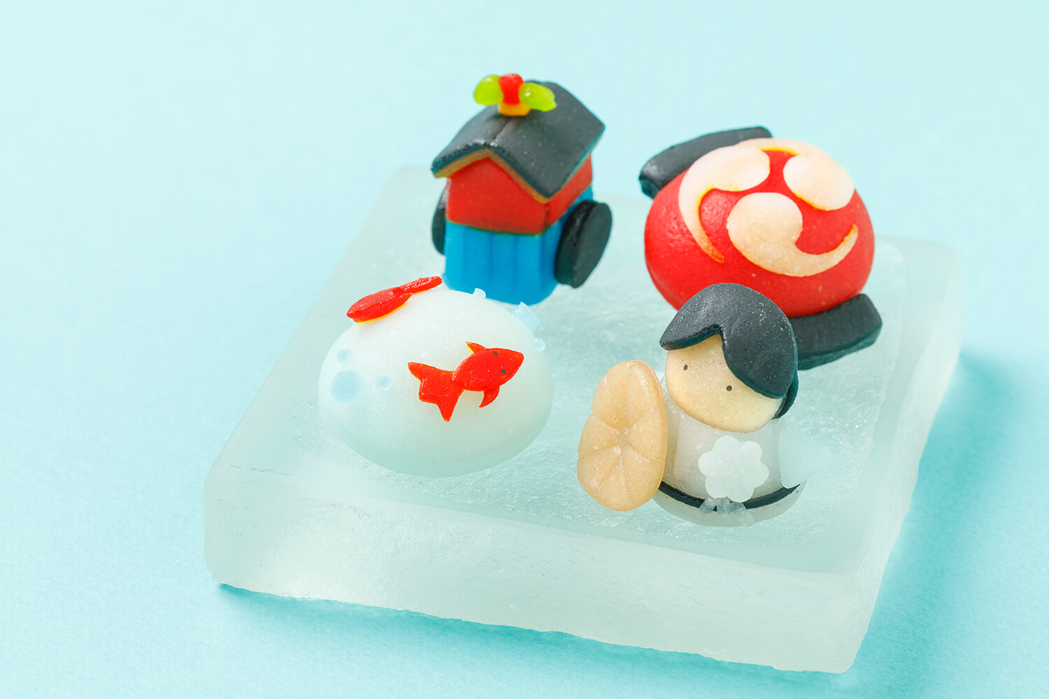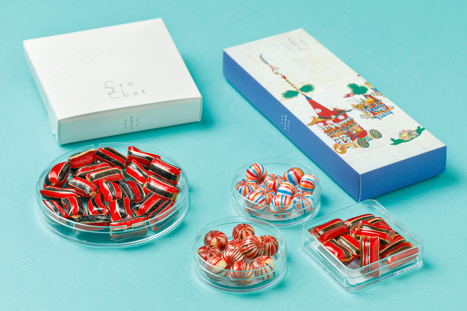 京都老字號糖果店的「鉤針」是一個像玻璃製品一樣色彩精緻美麗的品牌。 限定口味有三種:紅黑對比的「祇園山鉾」(黑醋栗口味)、「祇園神轎」(黑加侖橙味)和圓形瑪麗形狀的「祇園音樂」(香蕉味)。 迷你尺寸的「Hina HIINA系列」有3件套,還可以選擇7月限定的戟盒。