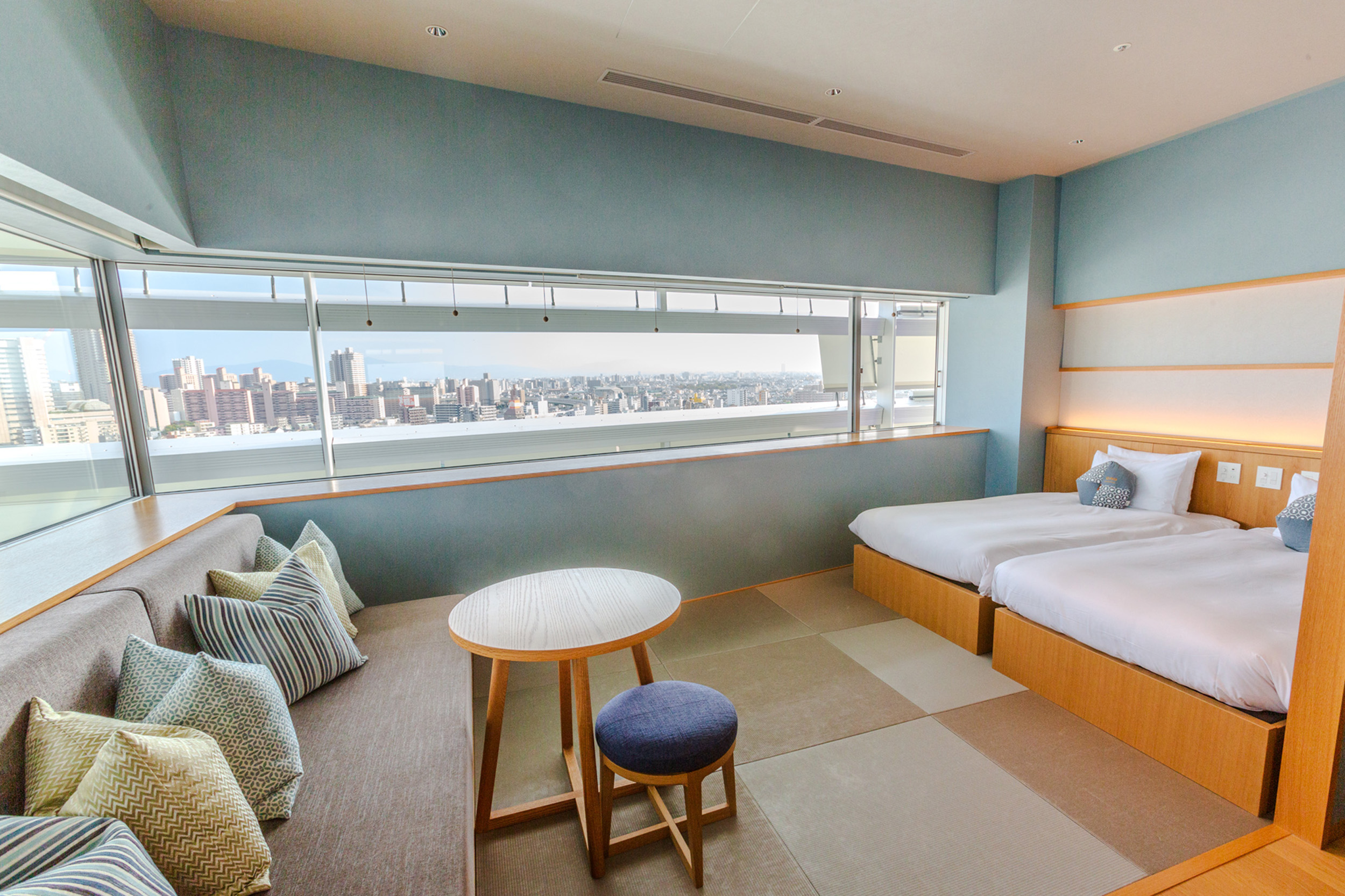 兩側的窗戶都俯瞰大阪市。 部分客房還能欣賞通天閣的景色。 黎明與黃昏時分染成漸層的城市景觀,是 Corner Twin 獨有的美麗風景。 榻榻米地板對赤腳來說很舒適,如果你在窗邊的沙發上放鬆,就能把時間花在客廳裡。