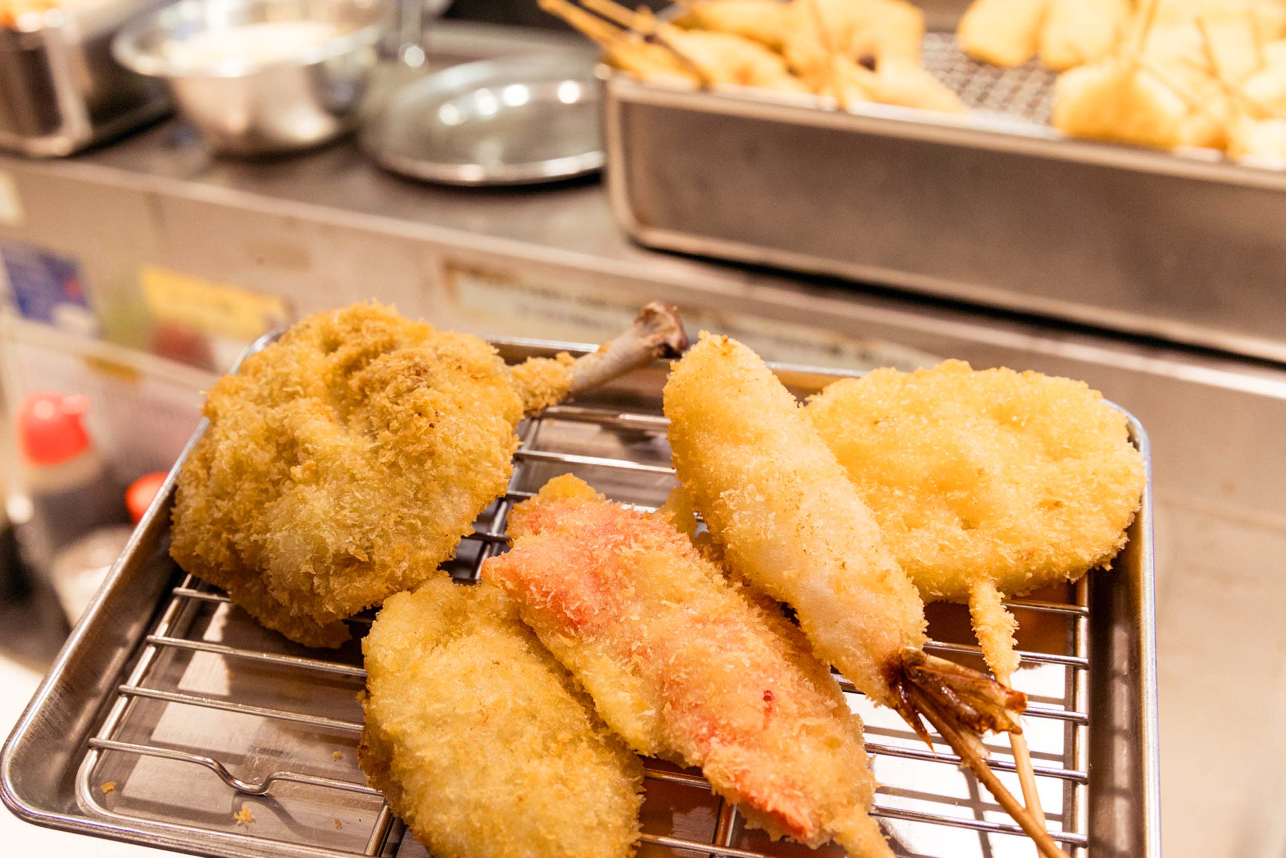 串炸每塊 120 日元起。 20多種小雞、牛肉串、紅薑、蝦、蓮藕等隨時供應。