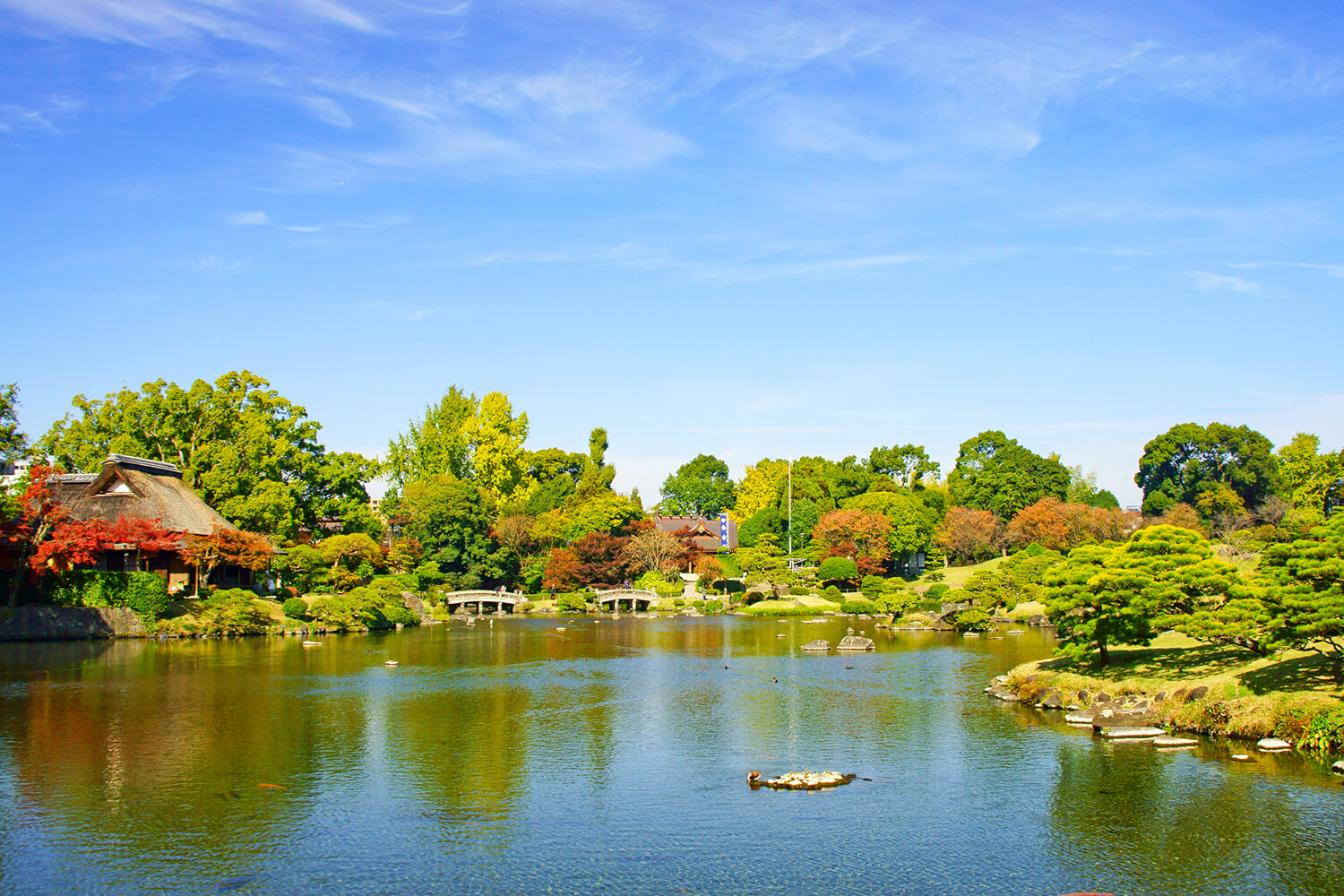 它是熊本市的一個漫步庭園,並被指定為國家級風景名勝及歷史遺址。 它由熊本藩細川氏首代家主細川忠利建造,並於第三代主細川常利在位期間完工。 以阿蘇水湧出的池塘為中心,園內有浮石、松樹和以富士山為藍本的山地建築和東海道風景的草坪,約30分鐘即可繞行。